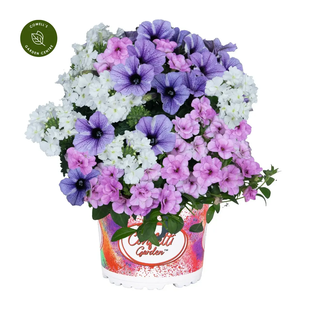 Confetti Garden™ Blueberry Cake is a beautifully balanced, pre-planted combination featuring soft lilac, blush pink, and crisp white blooms. The mix creates a full, rounded display with a delicate, pastel colour palette.