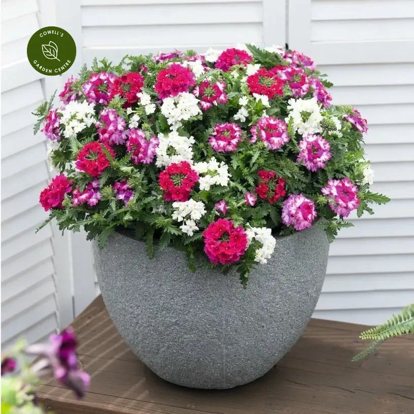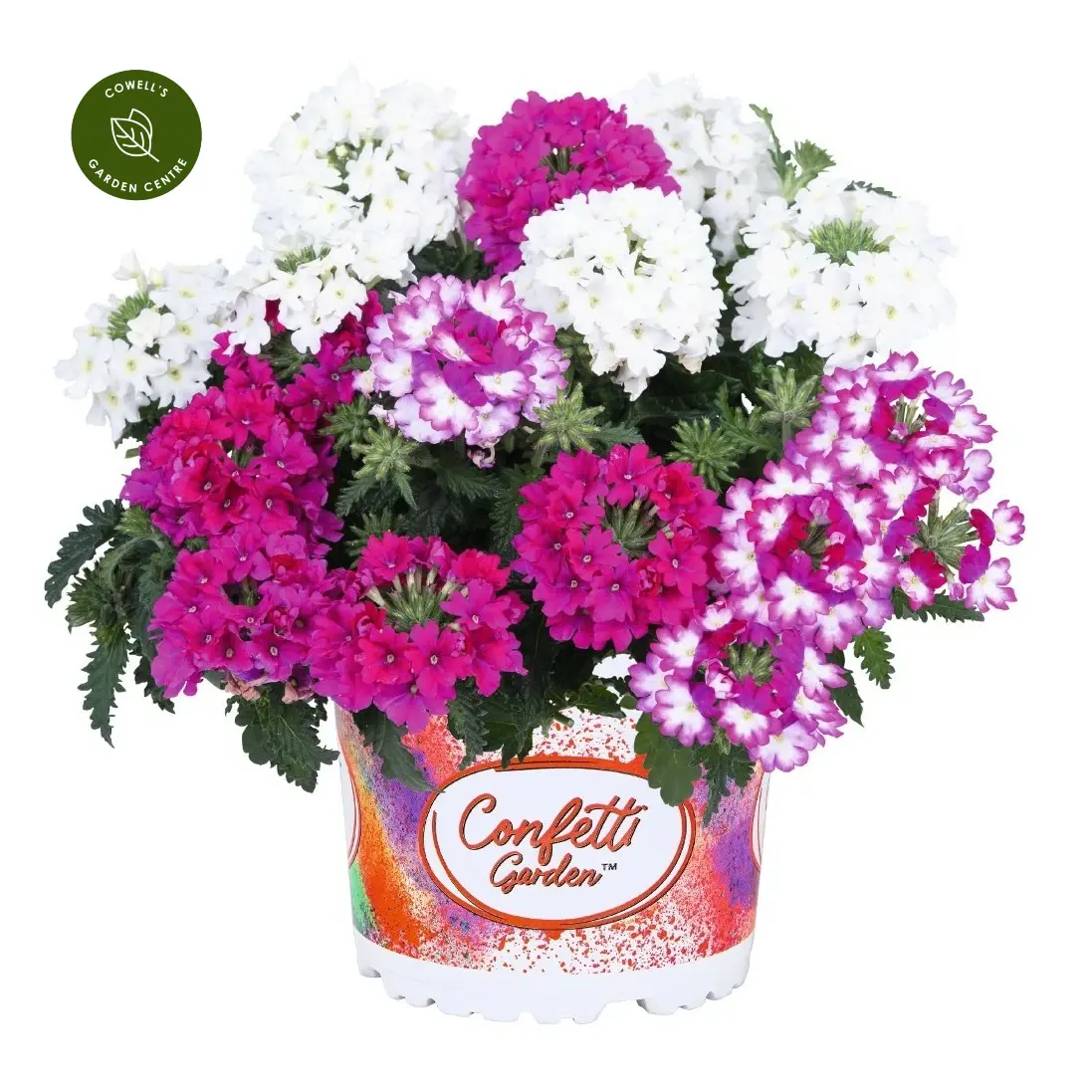Confetti Garden® Linda Girly is a charming, pre-planted combination featuring a soft and playful mix of pink, white, and bicolour Verbena. The clustered flowers create a full, textured display with a cheerful, cottage garden feel.