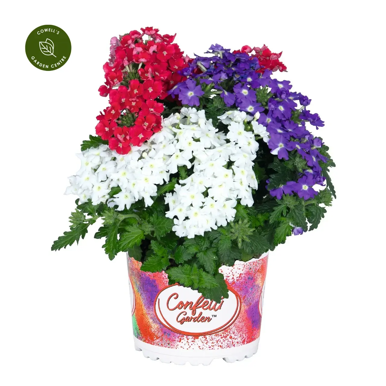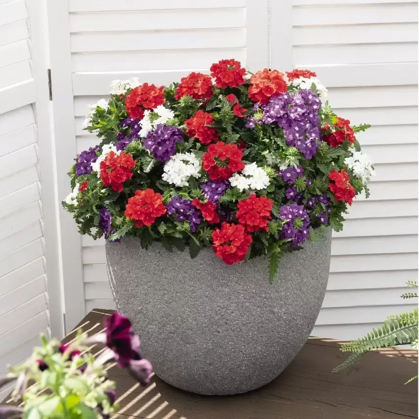 Confetti Garden® Linda Liberty is a vibrant, pre-planted mix combining bold red, rich purple, and crisp white verbena blooms for a striking, high-impact display. The tightly packed flower heads create a dense canopy of colour, giving an instant, full look.