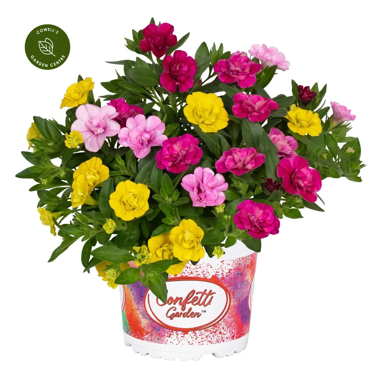 Confetti Garden® My Bonnie is a vibrant, pre-planted mix featuring fully double blooms in shades of rich pink, soft blush, and bright yellow. The rose-like flowers create a lush, textured display, packed tightly together for a bold and eye-catching finish.