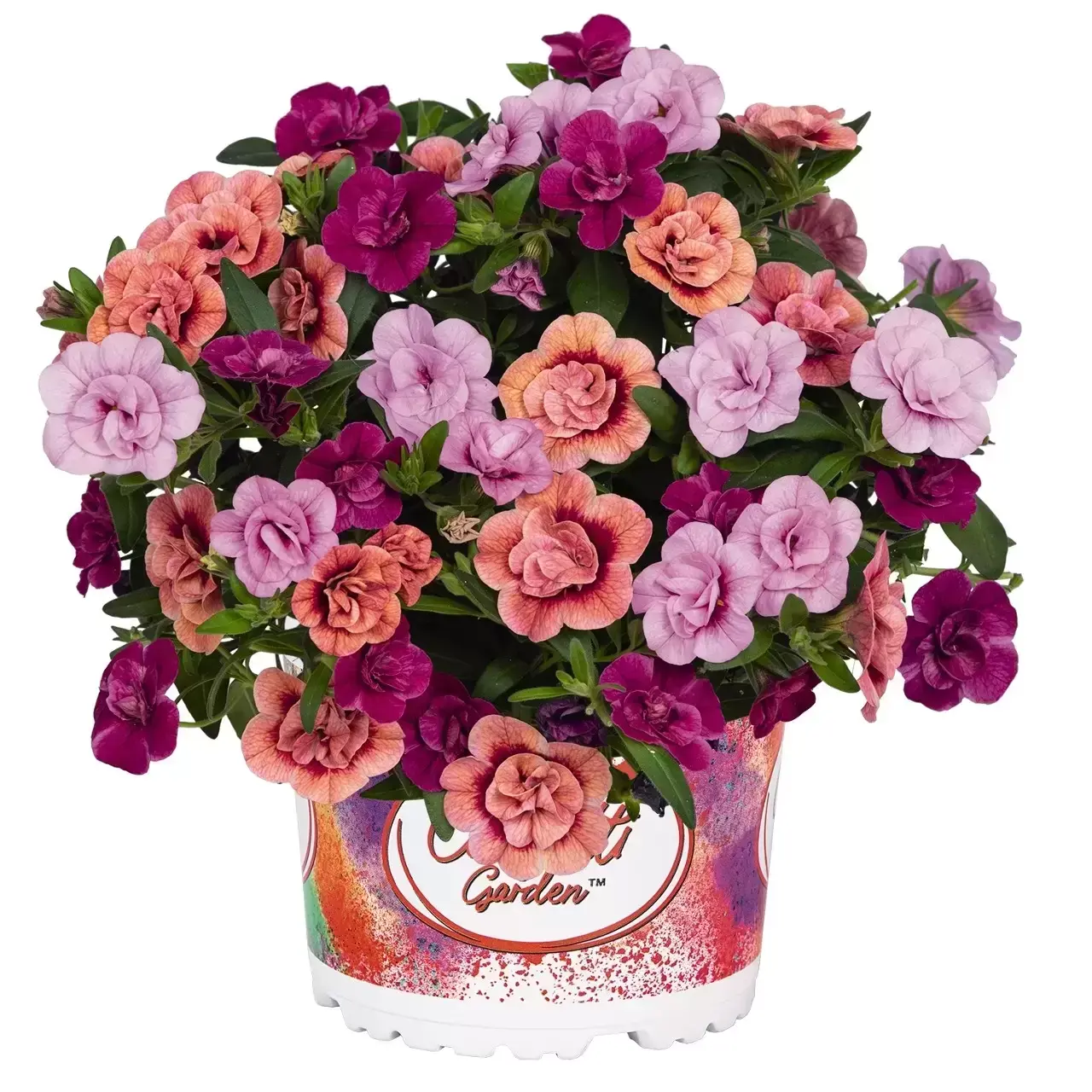 Confetti Garden® My Colour Clash is a bold and playful mix of double blooms in vibrant pink, soft lavender, and sunny yellow. The contrasting colours create a lively, high-energy display, while the rose-like flowers add texture and depth.