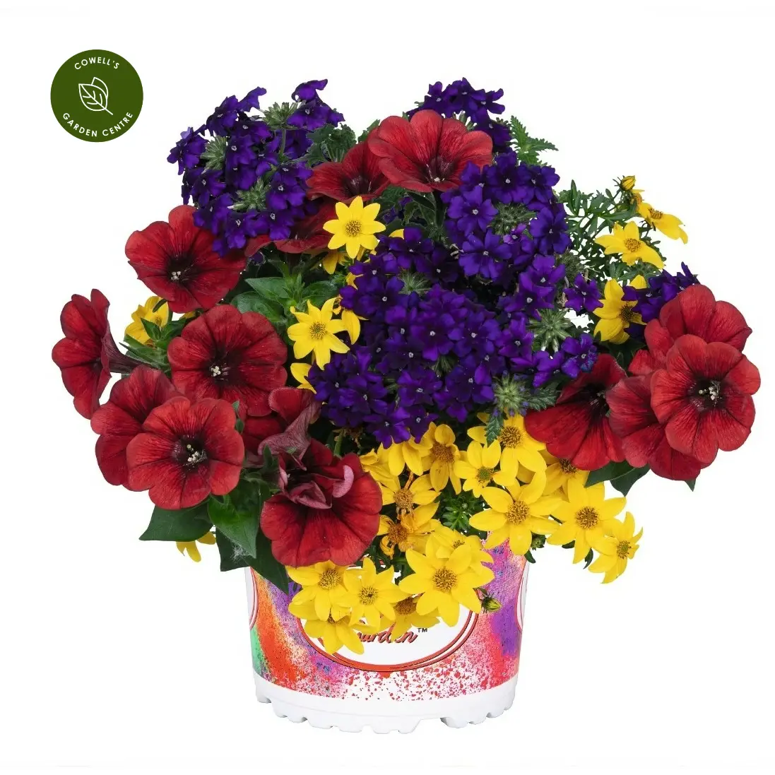 Confetti Garden® Patchwork is a bold, high-contrast mix that brings together rich red petunia blooms, vibrant golden bidens and deep purple verbena for a striking, multi-tonal display. The combination creates a lively, tapestry-like effect, packed with colour and texture.
