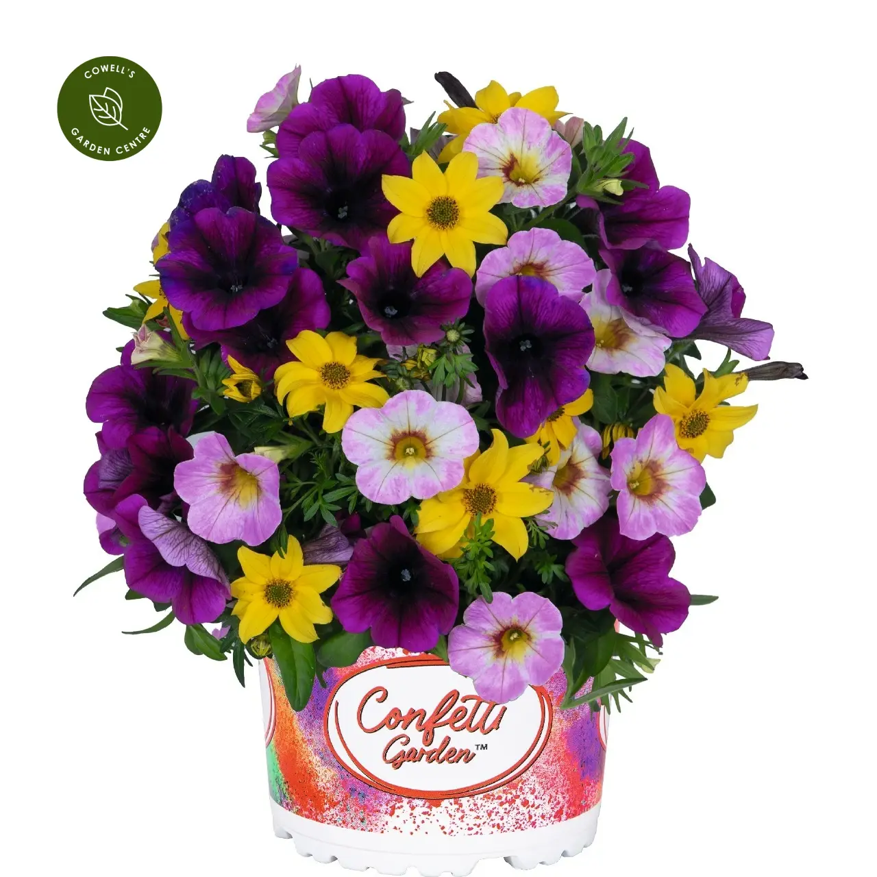 Confetti Garden® Starlight is a vibrant mixed planting that combines deep purple petunias, soft pink calibrachoa and bright golden bidens to create a lively, star-like display of contrasting colour. The blend offers a rich mix of tones that shimmer together, bringing energy and brightness to any summer setting.
