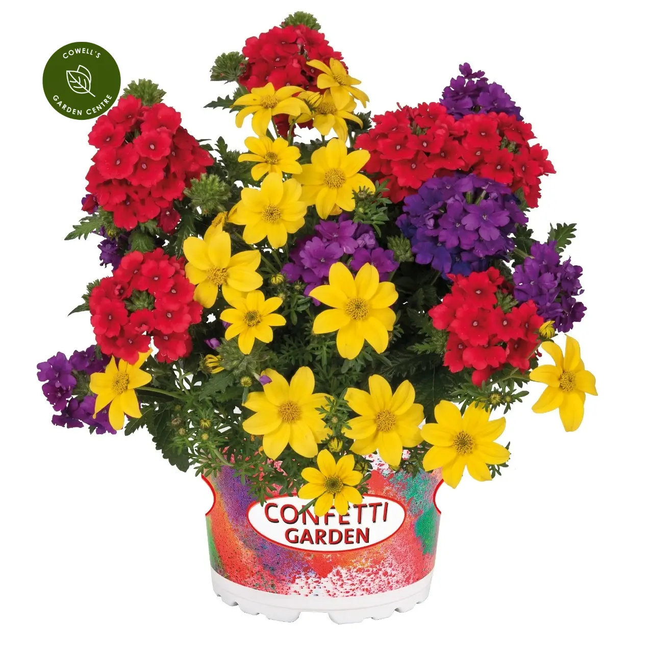 Confetti Garden® Sylvester is a bold and vibrant mix bursting with rich red, golden yellow and deep purple flowers, creating a striking, high-impact display. The combination of daisy-like blooms and clusters of verbena adds both structure and texture, delivering a lively, colourful arrangement.