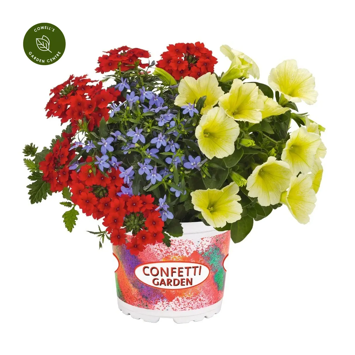 Confetti Garden® Water Colours 2027 is a beautifully balanced mix of soft lemon-yellow, rich red and airy blue tones, creating a relaxed, painterly display reminiscent of a summer garden in full bloom. The blend of trailing and mounding plants delivers both volume and movement, with contrasting textures adding depth and interest.