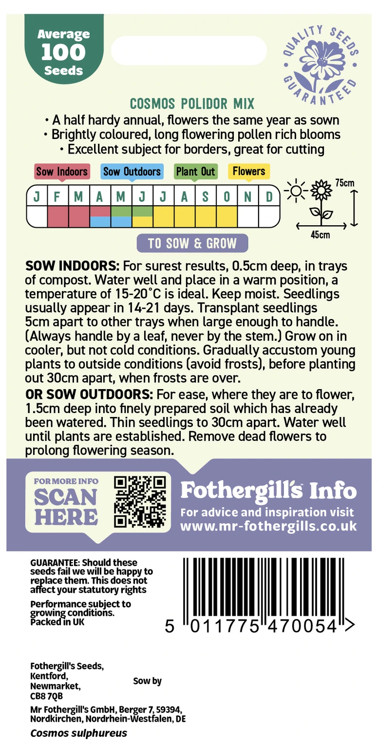 Nectar rich blooms in vivid, hot colours. Remove dead heads regularly to prolong the flowering season. Cosmos does well even in poor soils and dry summers.