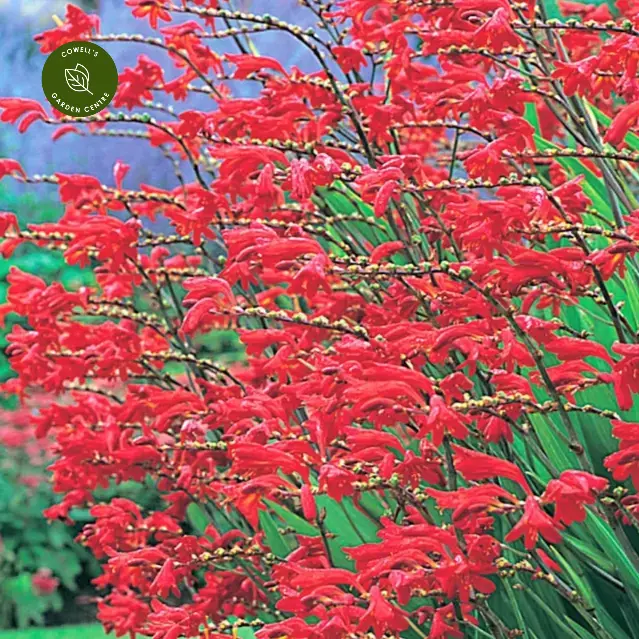 Crocosmia 'Emberglow' is a striking, late-summer flowering perennial producing arching sprays of glowing orange-red flowers with warm amber tones. Held on elegant, wiry stems above clumps of sword-like green foliage, it adds movement and vibrant colour to borders.