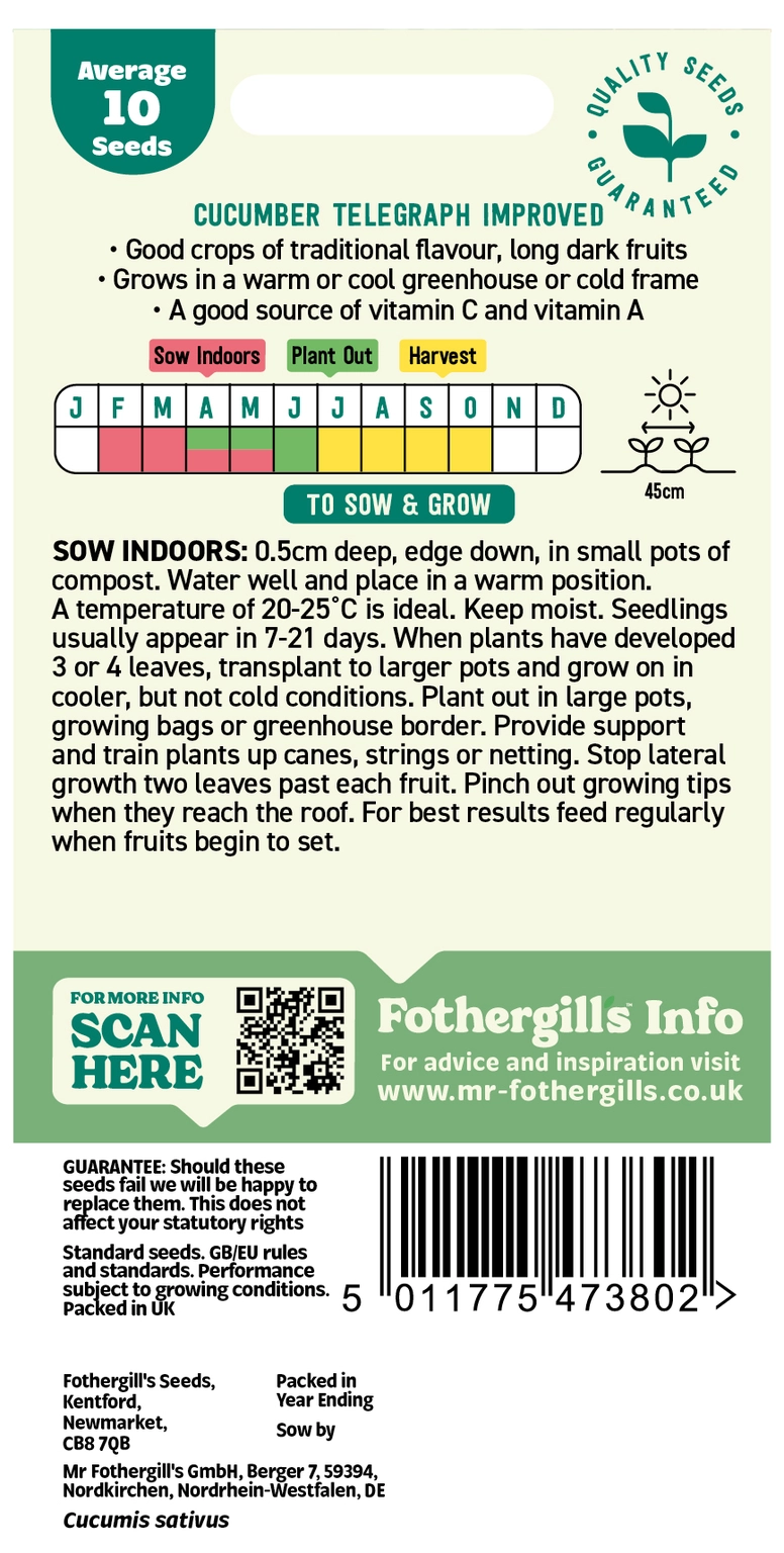 Classic greenhouse or cold frame variety. Cucumbers do best in a humid atmosphere, so damp down greenhouse floor regularly. Once fruits form, regular feeding will ensure best crops.