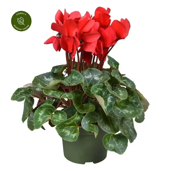 Cyclamen 'Halios Scarlet Red' is a bold and vibrant variety, producing masses of large, striking scarlet-red blooms from autumn through spring. The swept-back petals rise elegantly above a compact rosette of attractively marbled, evergreen foliage, creating a dazzling display of colour in the darker months. Perfect for seasonal planting, it provides reliable and long-lasting interest when many other plants are dormant.