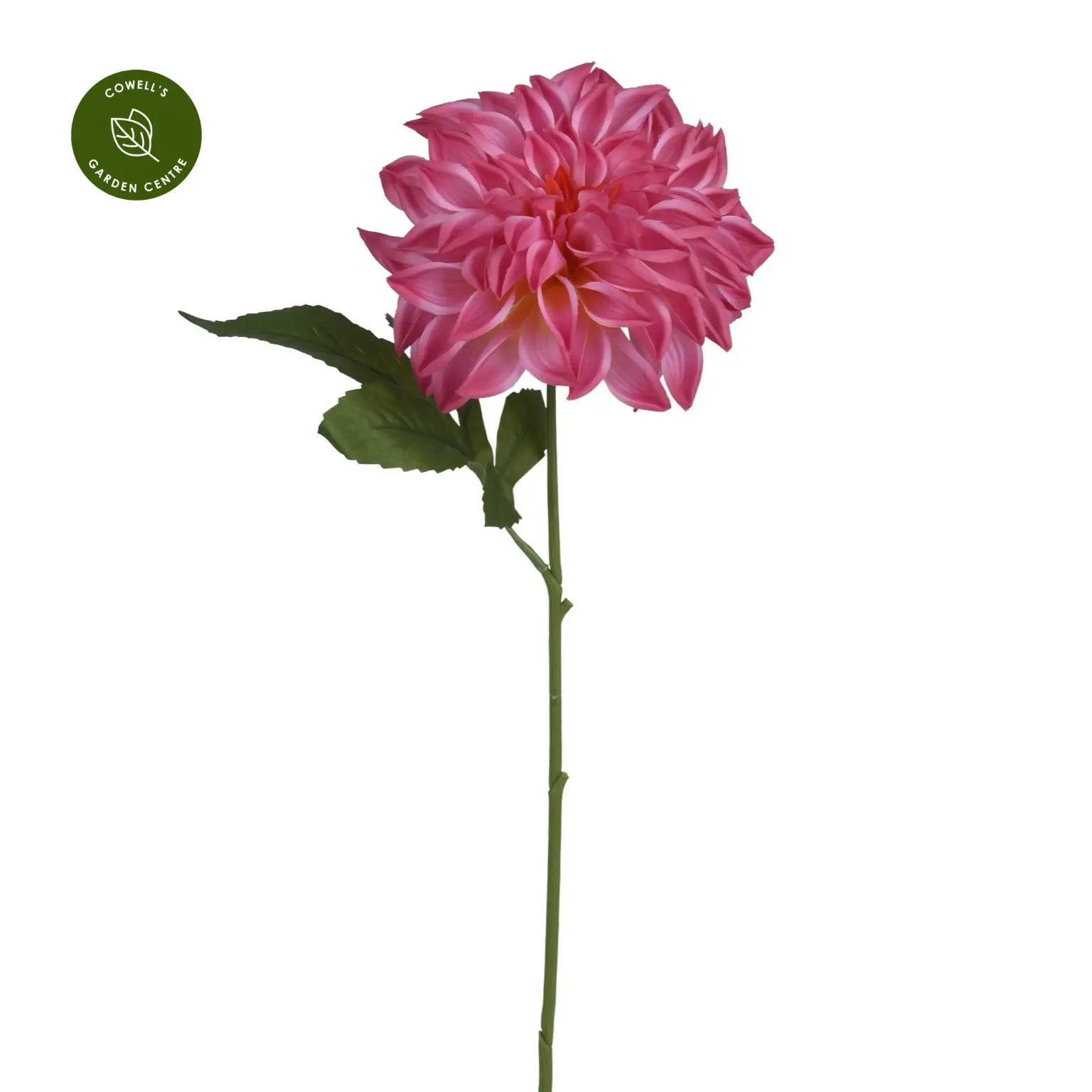 Realistic artificial Dahlia stem with a detailed flower head and rich green foliage, available in a range of colours for flexible indoor styling.