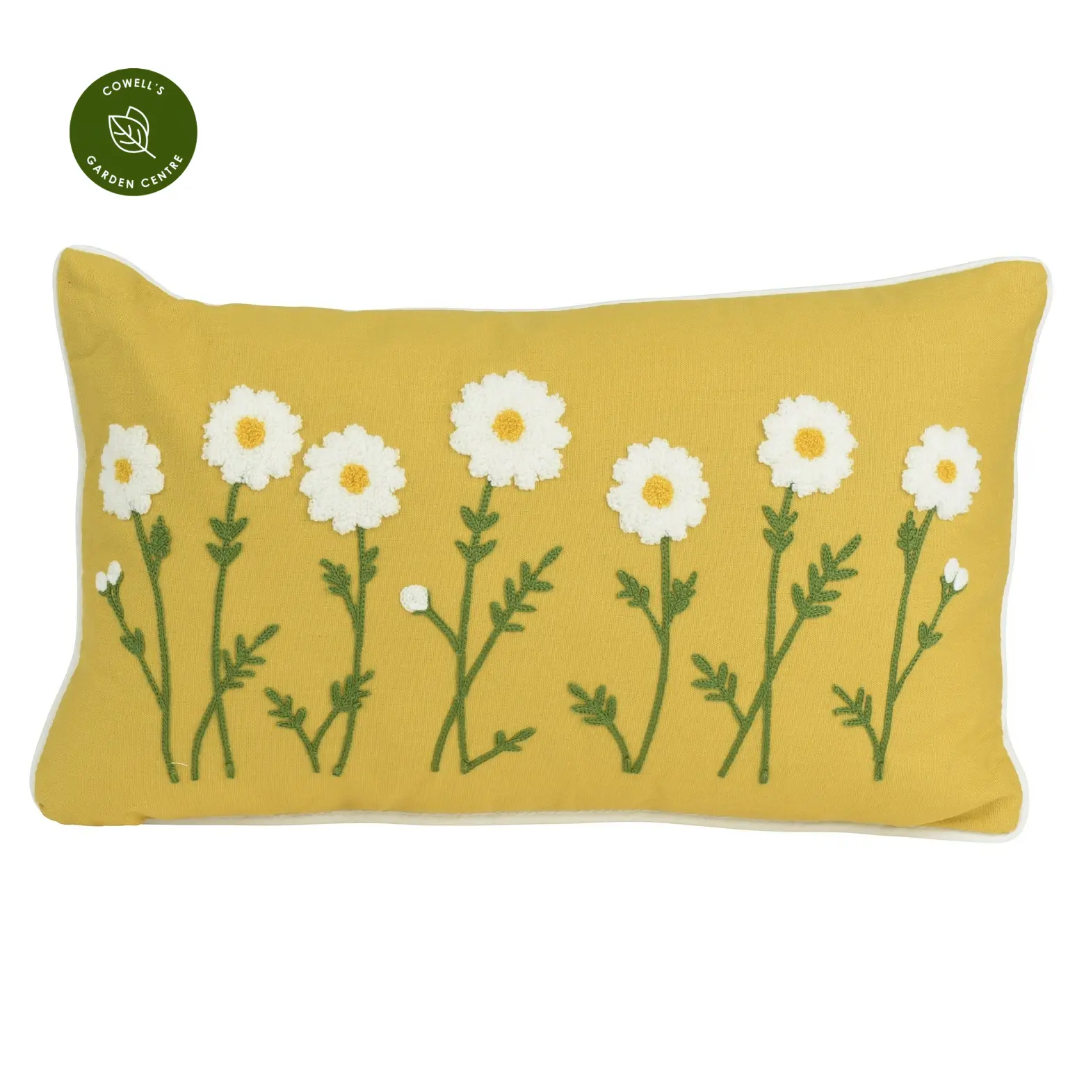 A stylish rectangular daisy themed cushion which adds a cheerful, summery touch to your home. Featuring raised daisy detailing on a warm yellow background, this cushion brings texture, colour and charm to sofas, chairs and beds.
