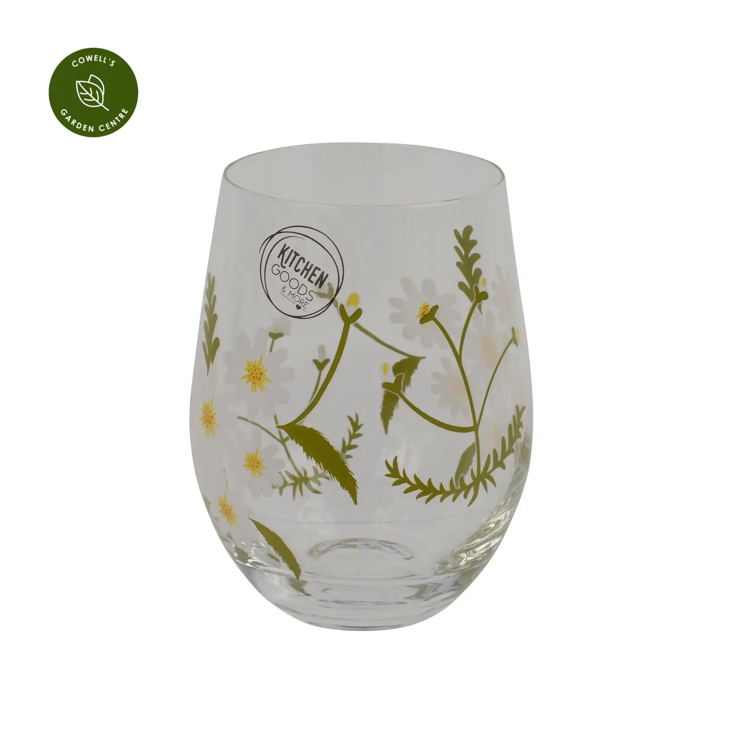 A clear glass tumbler decorated with a delicate daisy pattern, bringing a fresh, floral touch to everyday drinks and relaxed table settings.