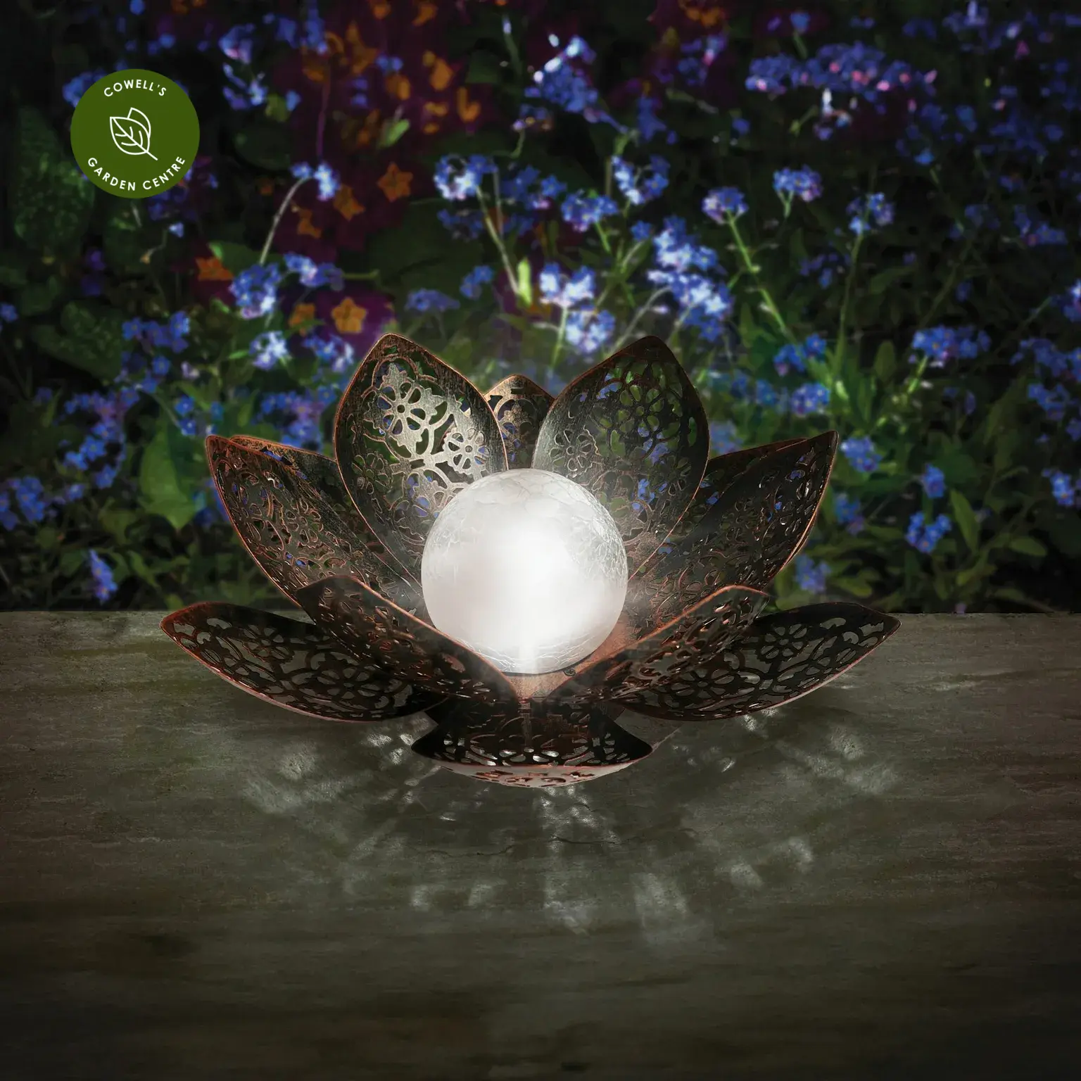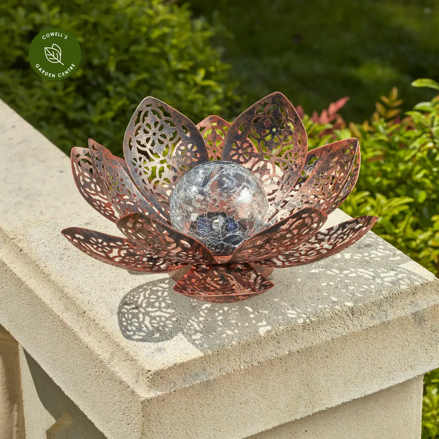 Add a touch of elegance to your garden with this solar lotus stake light, designed to create a beautiful silhouette effect by night and a striking feature by day. The crackle glass globe softly diffuses the light, shifting between white and colour-changing tones for a gentle, ambient glow.