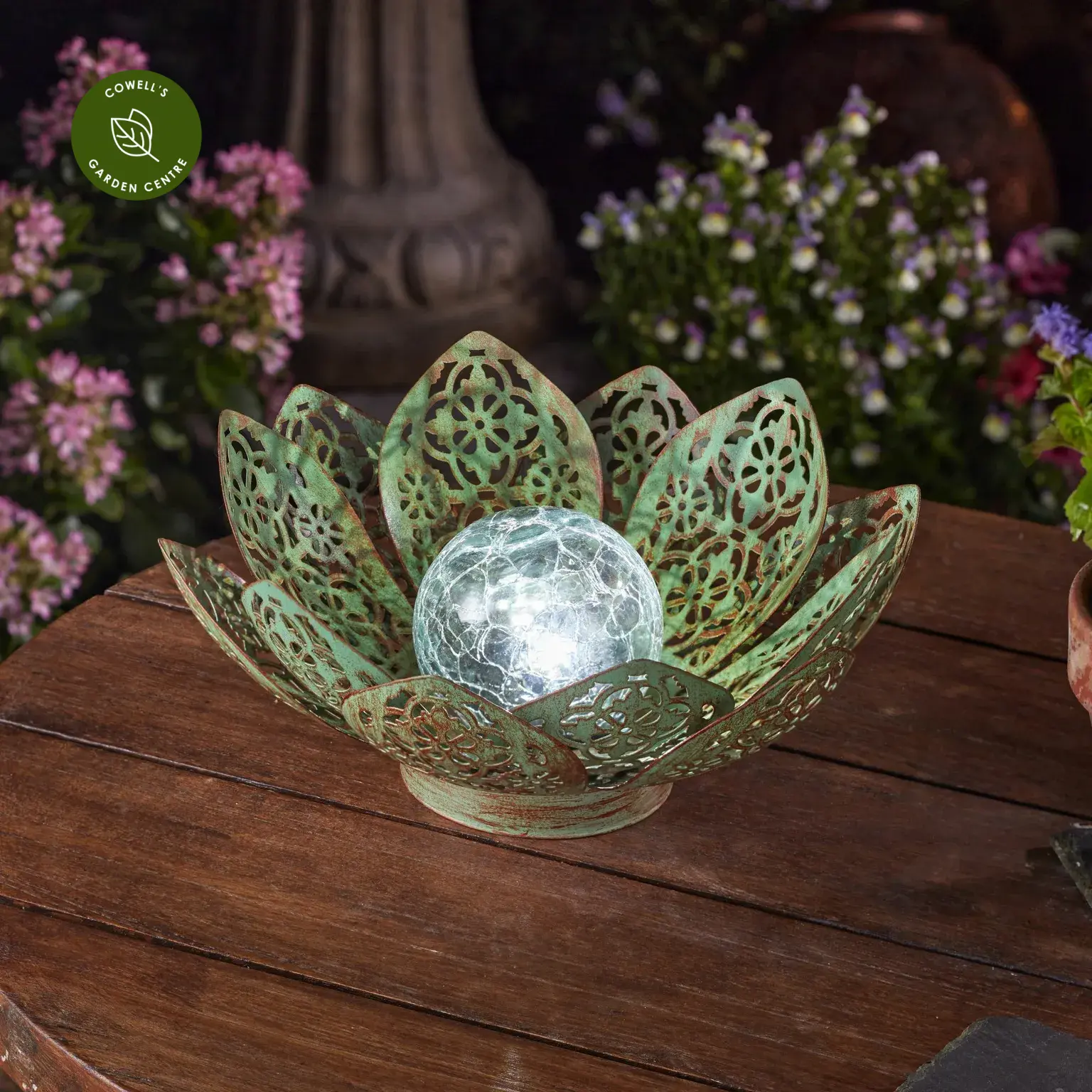 Add a touch of elegance to your garden with this solar lotus stake light, designed to create a beautiful silhouette effect by night and a striking feature by day. The crackle glass globe softly diffuses the light, shifting between white and colour-changing tones for a gentle, ambient glow.