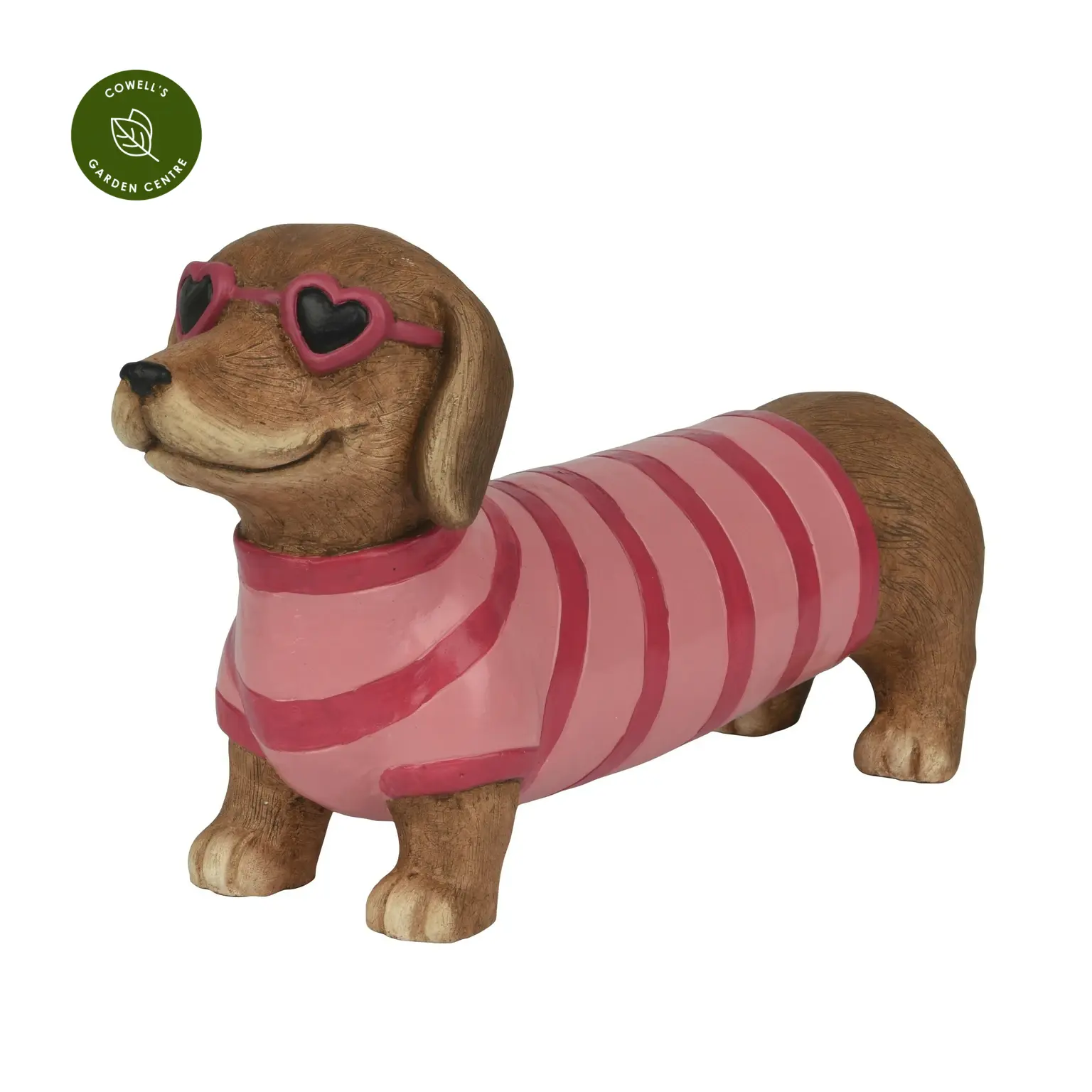 A fun and feel-good dachshund ornament designed to bring instant personality to your home. Made from lightweight magnesium and finished with heart-shaped sunglasses and a striped body, it’s a playful decorative piece perfect for adding character.