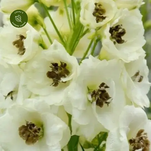 Delphinium 'Celebration' is an elegant perennial producing tall spires of creamy white flowers with dark contrasting centres. The large, open blooms are closely packed along sturdy stems, creating a dramatic vertical display above clumps of deeply divided green foliage.