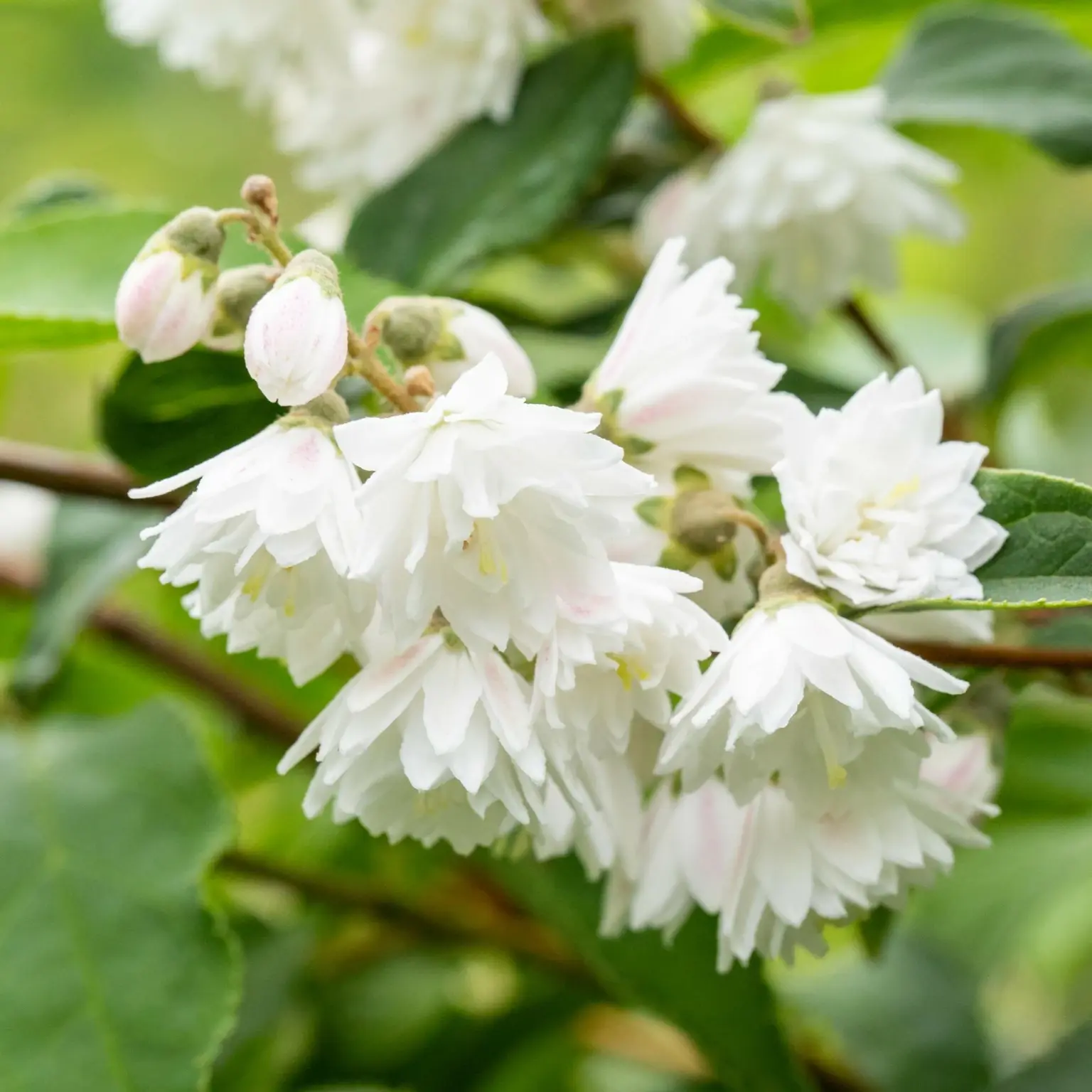 Deutzia scabra 'Plena' is a tall, vigorous deciduous shrub valued for its impressive size and showy summer display. Bushy growth of fresh green foliage provides a strong framework, from which large, dense clusters of double white flowers emerge, each delicately blushed with soft pink.