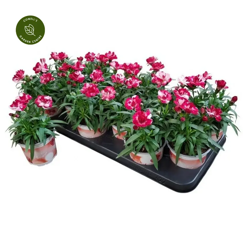 Dianthus 'Sprint Red & Proud' is a compact, floriferous perennial producing bold red and white blooms that stand out beautifully against neat grey-green foliage. The lightly scented flowers provide strong seasonal colour and are perfect for adding vibrant accents to borders, containers, and cottage-style planting schemes.