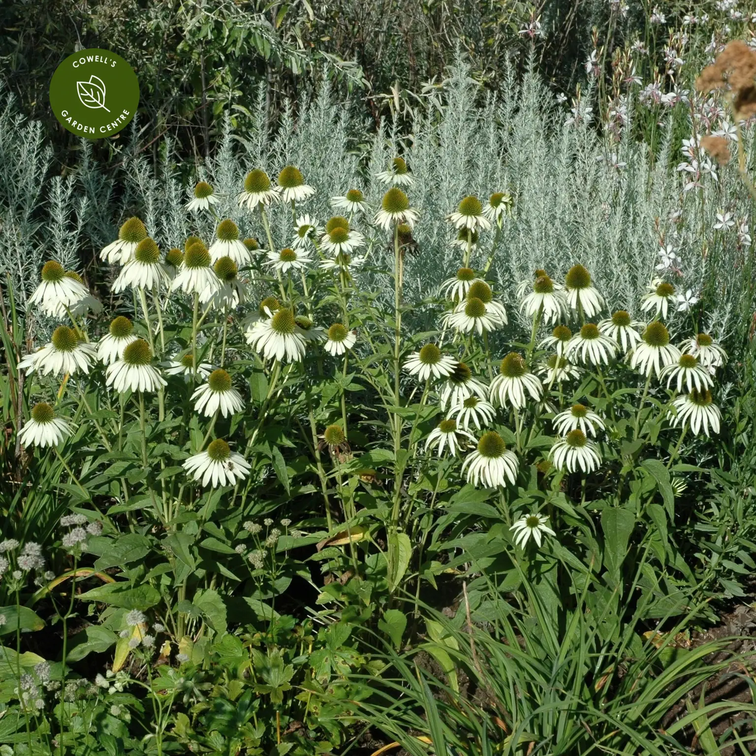 Echinacea purpurea 'Alba' is a graceful perennial producing large, daisy-like flowers with slender white petals surrounding prominent golden-yellow centres. Flowering through summer, it adds brightness and structure to sunny borders.