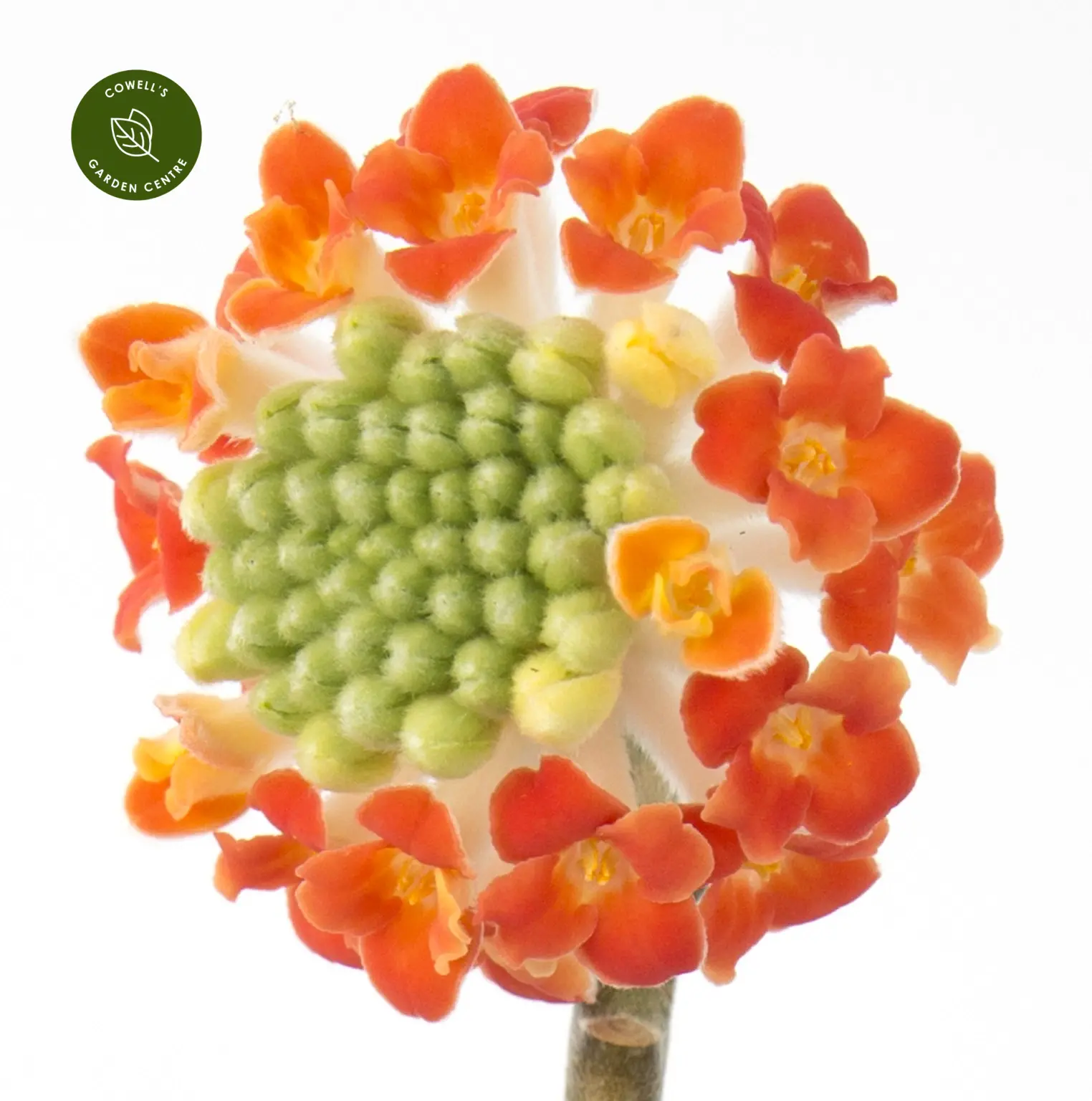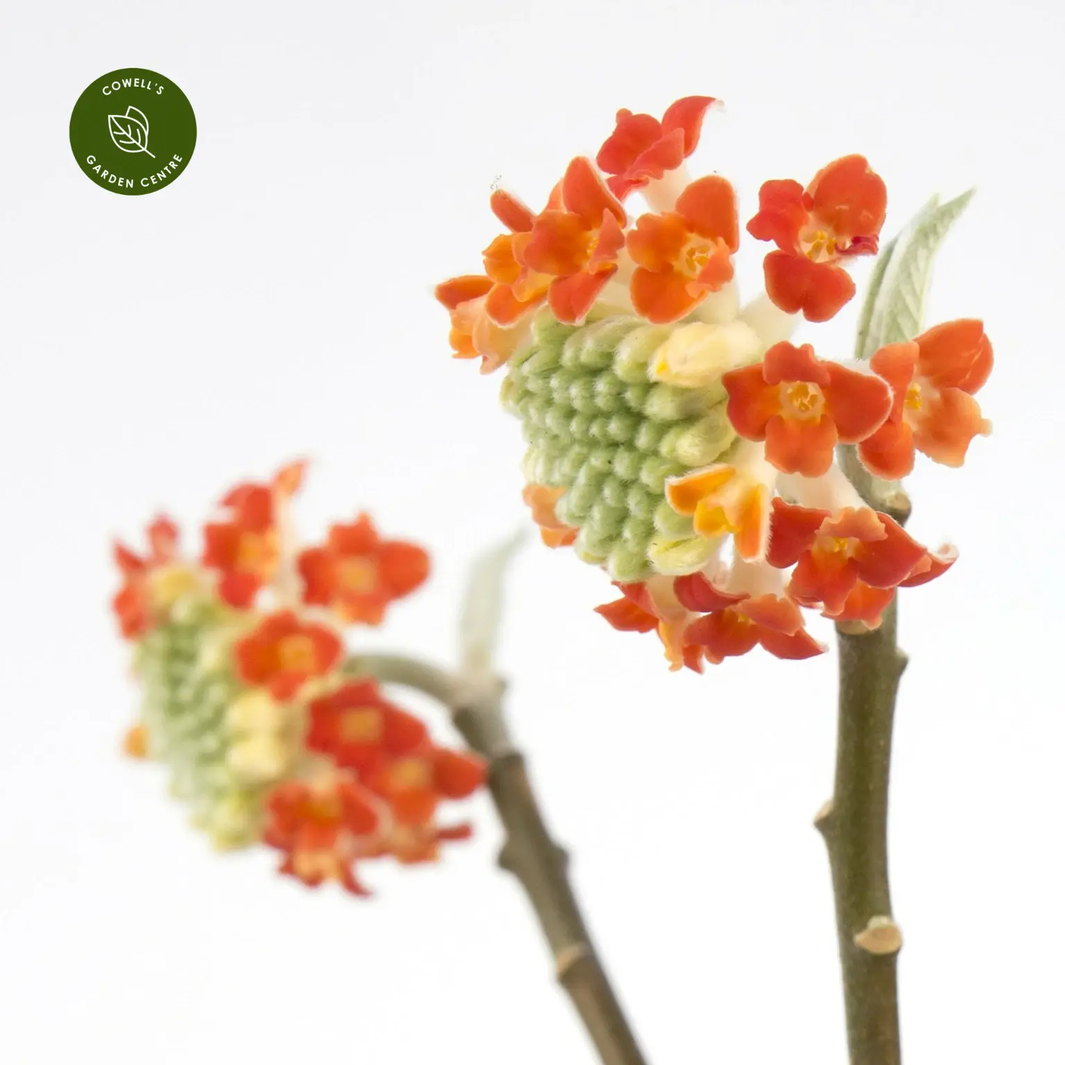 Edgeworthia chrysantha 'Red Dragon' is a striking deciduous shrub prized for its sweetly fragrant, coral-red flower clusters that appear on bare stems from January to March. The rounded heads of tubular blooms provide a vivid splash of colour through late winter and early spring, creating a focal point when little else is flowering. As the seasons progress, the plant develops lush, deep green foliage with a subtle silver sheen, adding texture and contrast into autumn.
