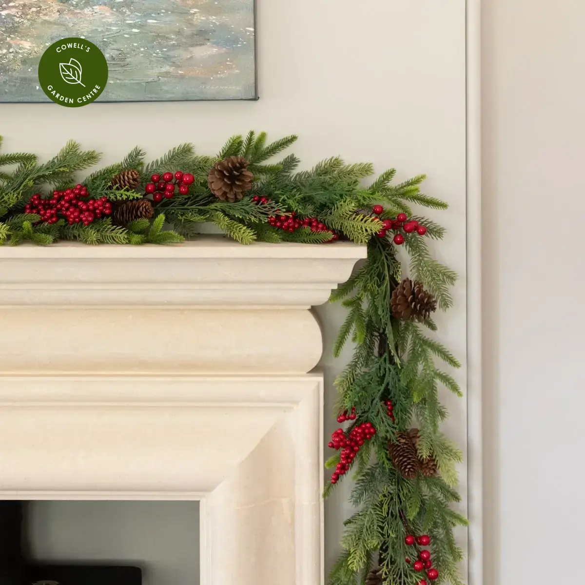 Rich green artificial garland bearing textural foliage and holly berries, to use as a table decoration or to elevate your Christmas displays.