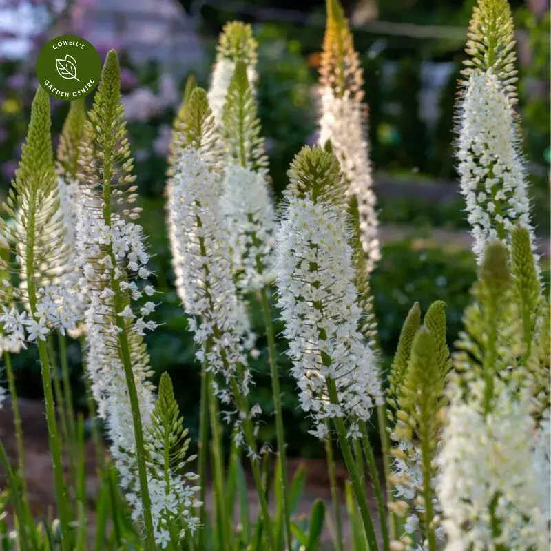 Eremurus 'Line Dance' is a striking architectural perennial producing tall, elegant spires of creamy white flowers that rise above a base of narrow, strap-like foliage. The densely packed blooms open from the base upwards, creating a beautiful, tapering effect.