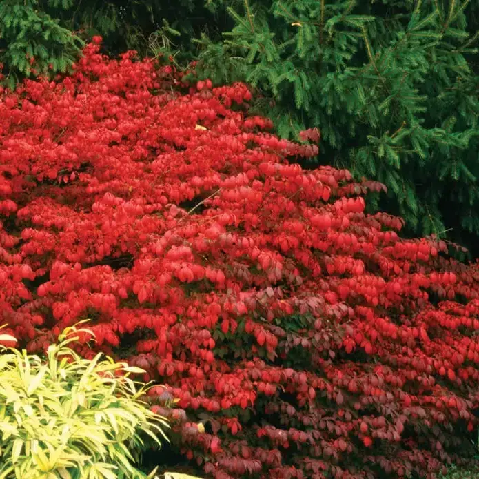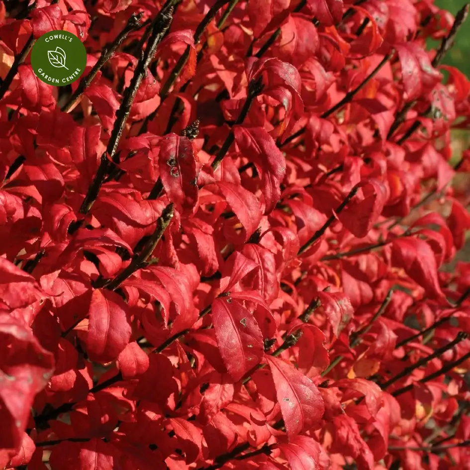 Euonymus alatus 'Fire Ball' is a dense, rounded deciduous shrub valued for its outstanding seasonal colour. Fresh green foliage through spring and summer transforms into a vivid, fiery red in autumn, creating a dramatic focal point in the garden.