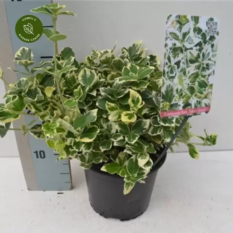 Euonymus fortunei 'Silver Queen' is a bold, reliable evergreen shrub with striking variegated foliage. Its glossy deep green leaves are edged in creamy-white that can flush silvery-pink in cooler weather, providing year-round brightness and contrast. Tough and adaptable, it brings structure and colour to a wide range of planting schemes.