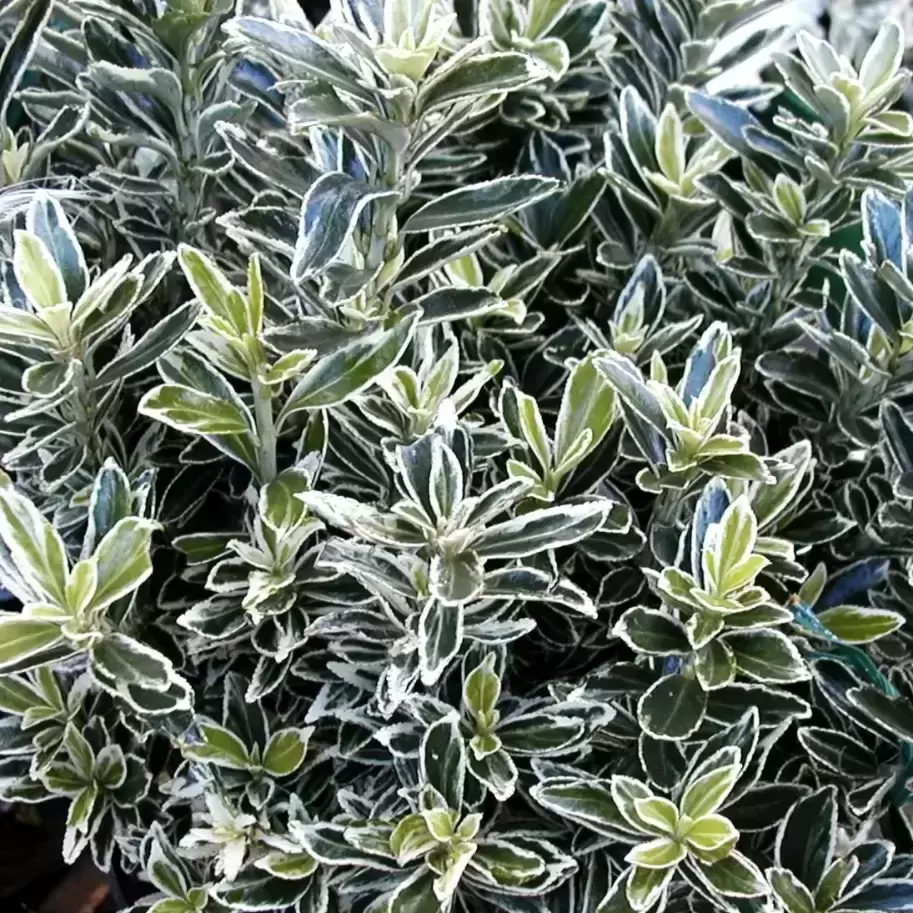 Euonymus 'Microphyllus Albovariegatus' is a neat and compact evergreen shrub, prized for its small, glossy dark green leaves edged with creamy-white margins. Its bushy, rounded habit provides year-round structure and a bright, elegant contrast in the garden.