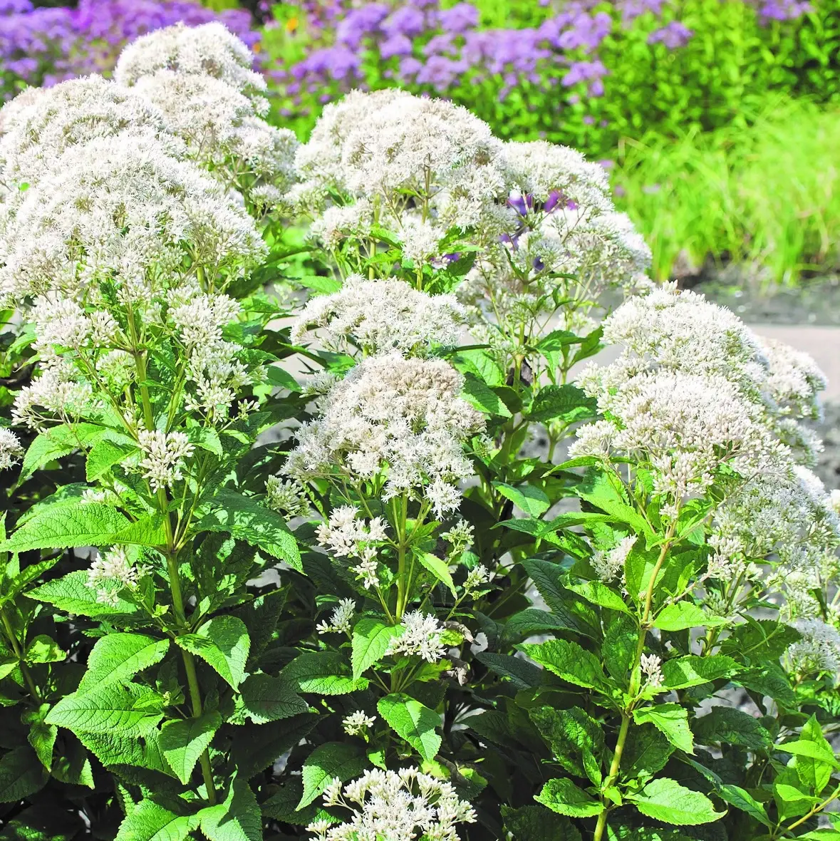Eupatorium 'Ivory Towers' is a tall, architectural perennial producing elegant domes of soft white flowers held on strong, upright stems. Its airy blooms create a light, natural effect while adding impressive height to the garden.