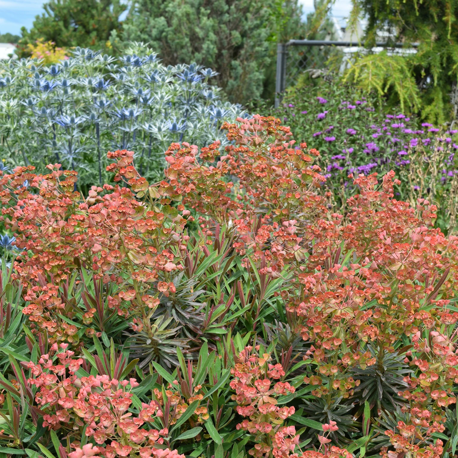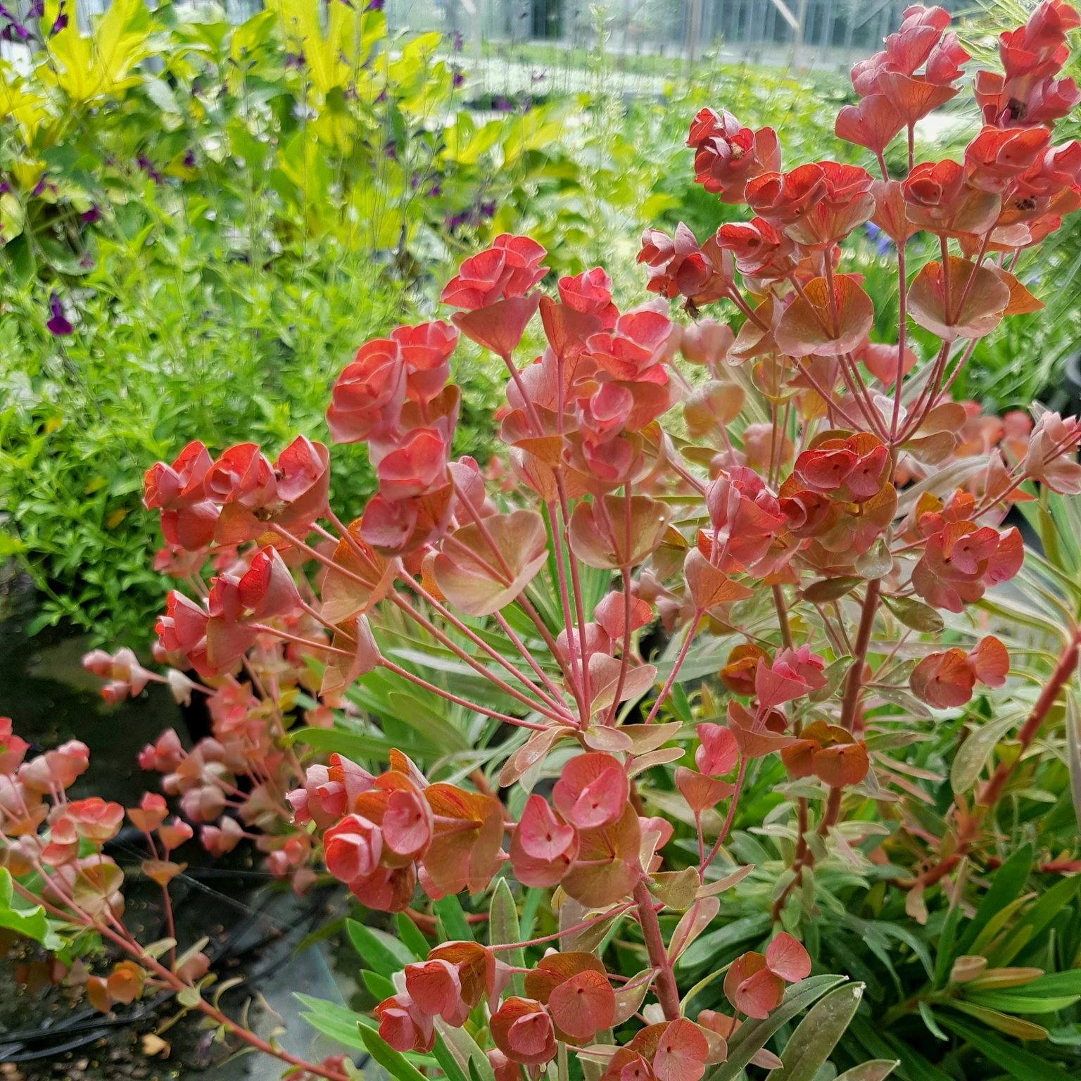 Euphorbia 'Galaxy Glow' is a striking semi-evergreen perennial with unique colour-changing flowers and long-lasting seasonal interest. Beginning in winter, the flower bracts emerge in fresh green tones before shifting through extraordinary shades of salmon-pink and rose, set against neat green foliage. This extraordinary colour play continues well into spring, and the plant blooms again in summer, holding its vibrant hues longer than most other spurges.