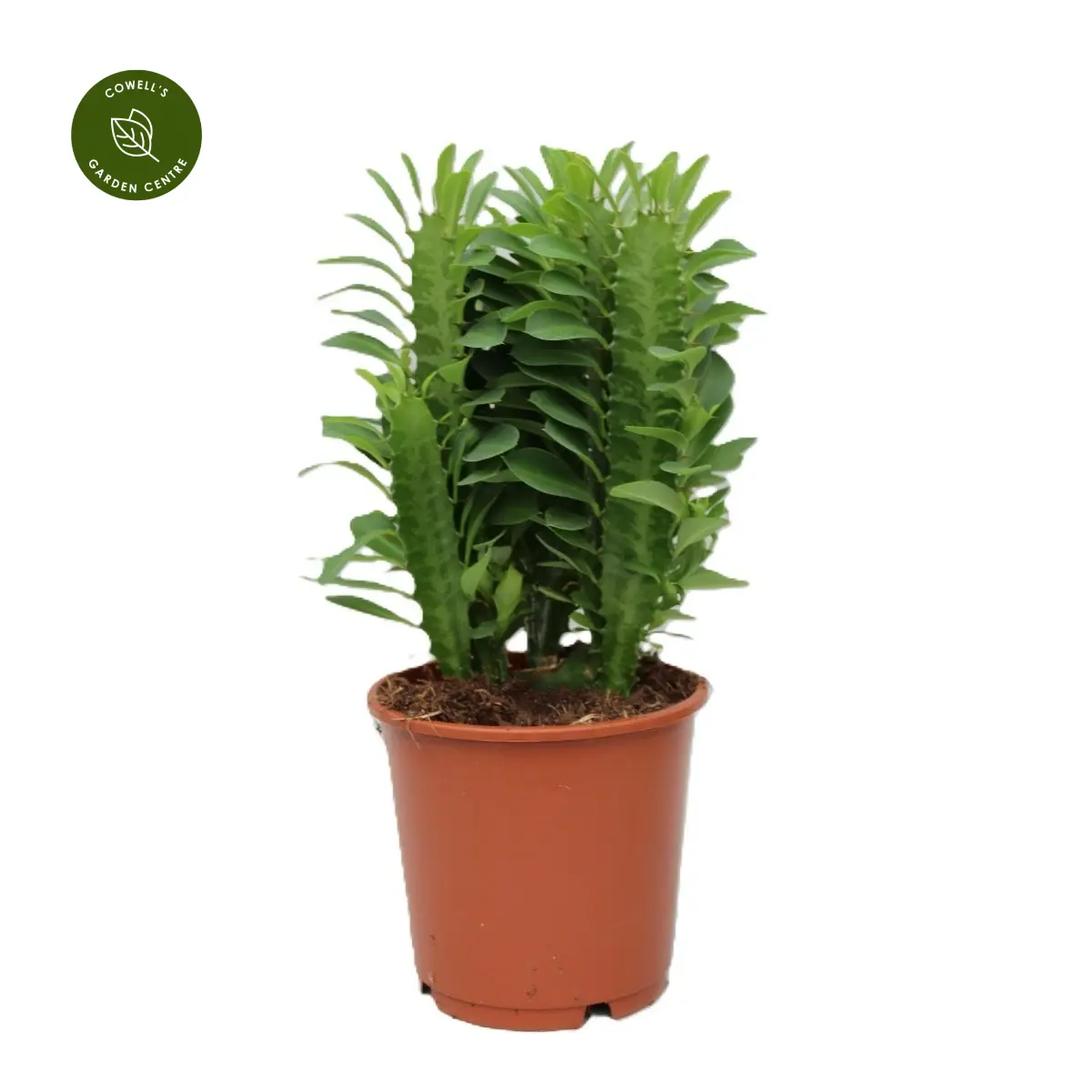 Euphorbia trigona (Green) is an architectural, upright succulent with tall, cactus-like stems and small green leaves growing along its ridges. Its bold, columnar form makes it a striking statement plant for bright interiors, though it is not a true cactus.
