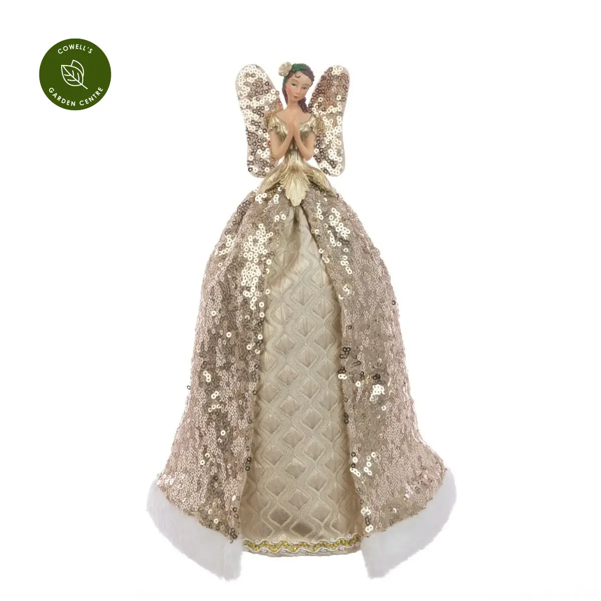 Wonderful Christmas tree fairy with golden dress and sequinned details.