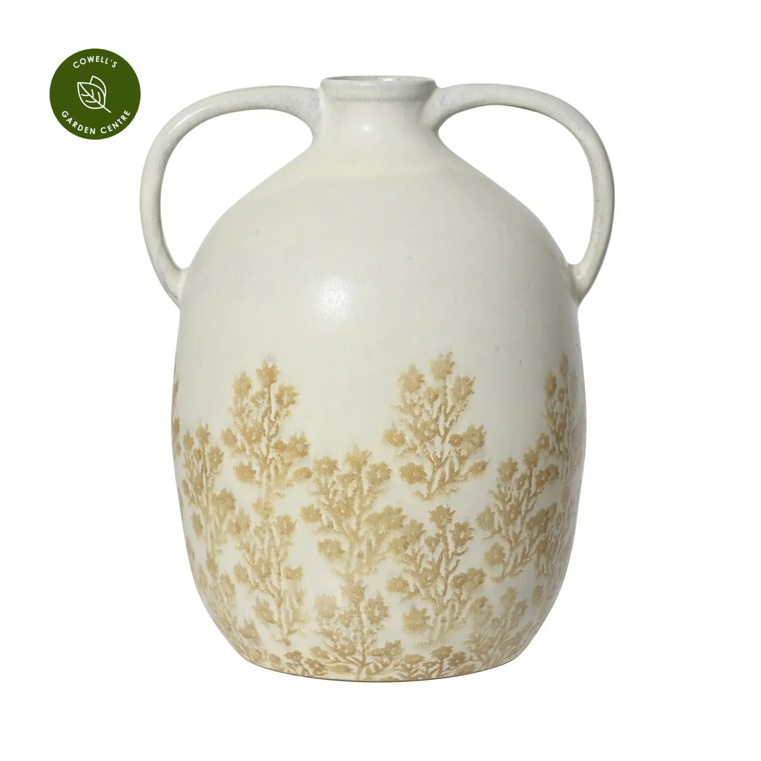 A beautifully handcrafted terracotta jug finished in soft matt off white, featuring two handles and a delicate brown floral motif that adds subtle texture and charm to any setting.