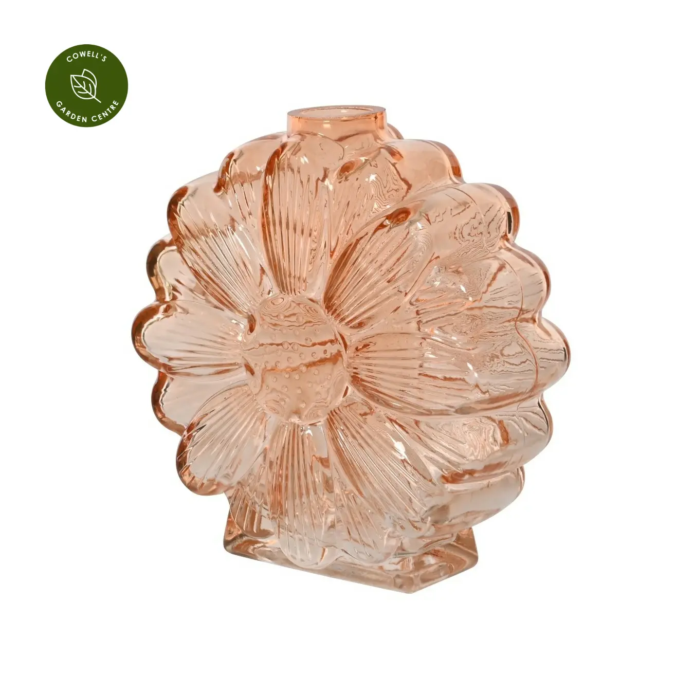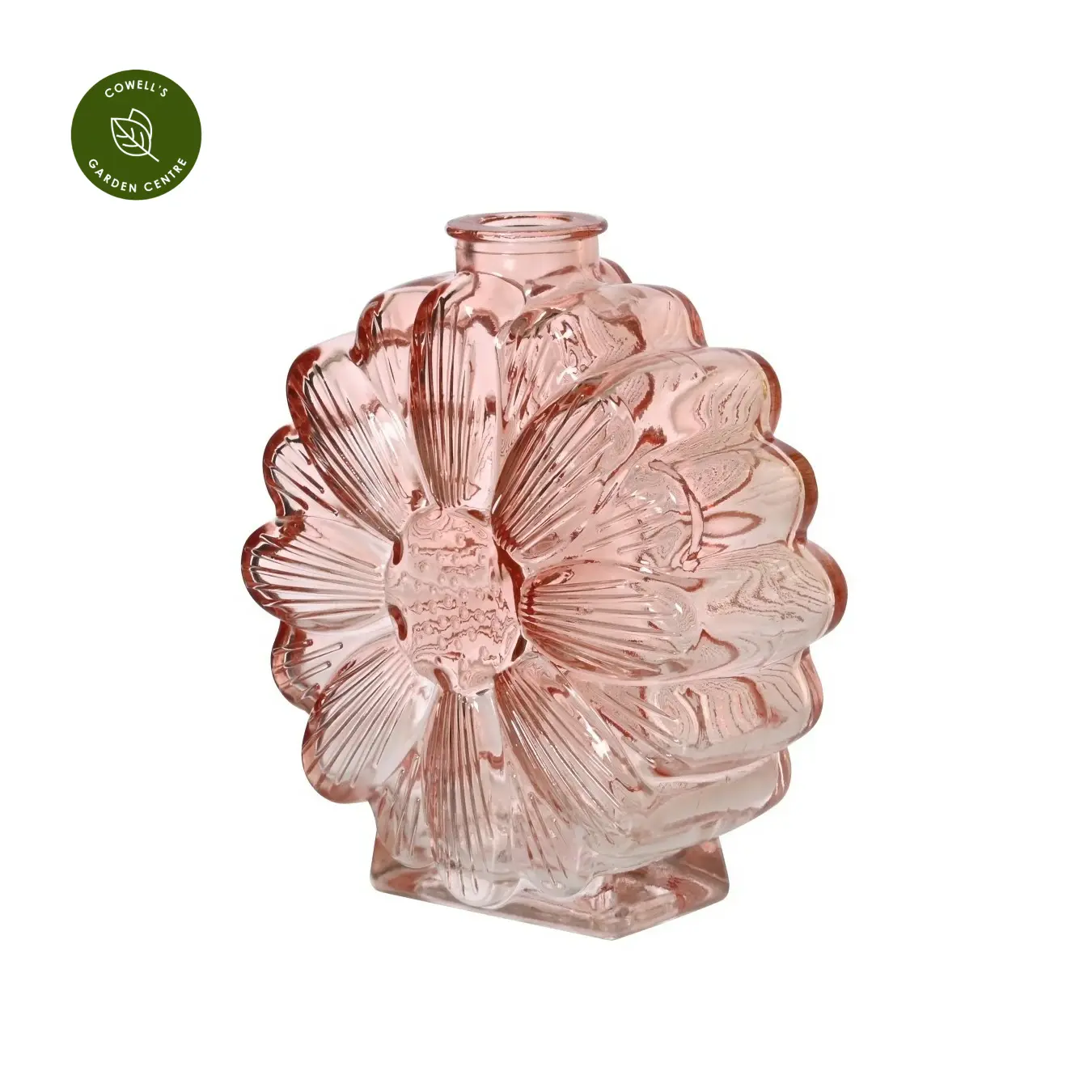A decorative glass vase with a sculptural flower shape, made from clear coloured glass to gently catch and reflect the light.