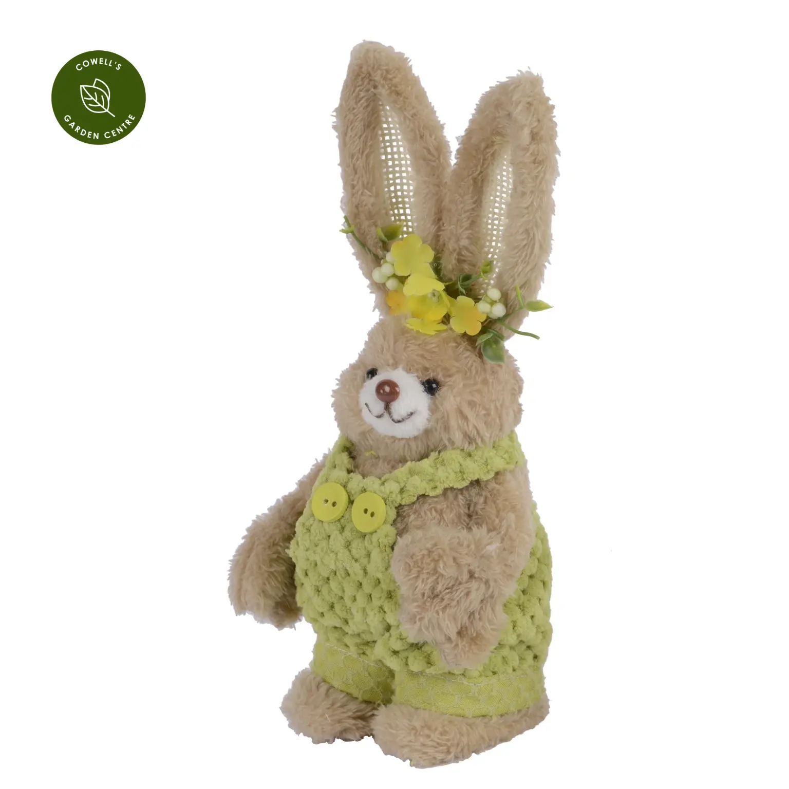 Fluffy Easter bunny with cute clothing and weighted feet to stand.