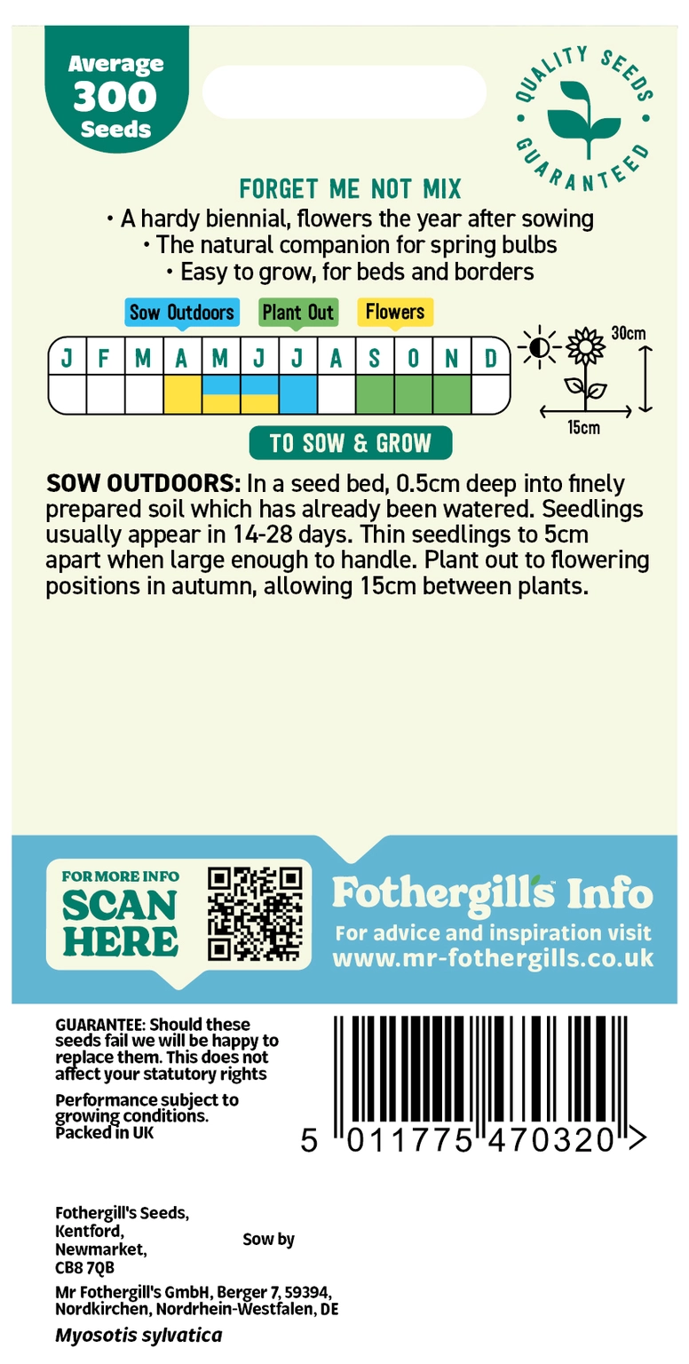 Easy to grow spring favourite. Forget-me-nots do best in light or part shade, as they originate from woodland areas.