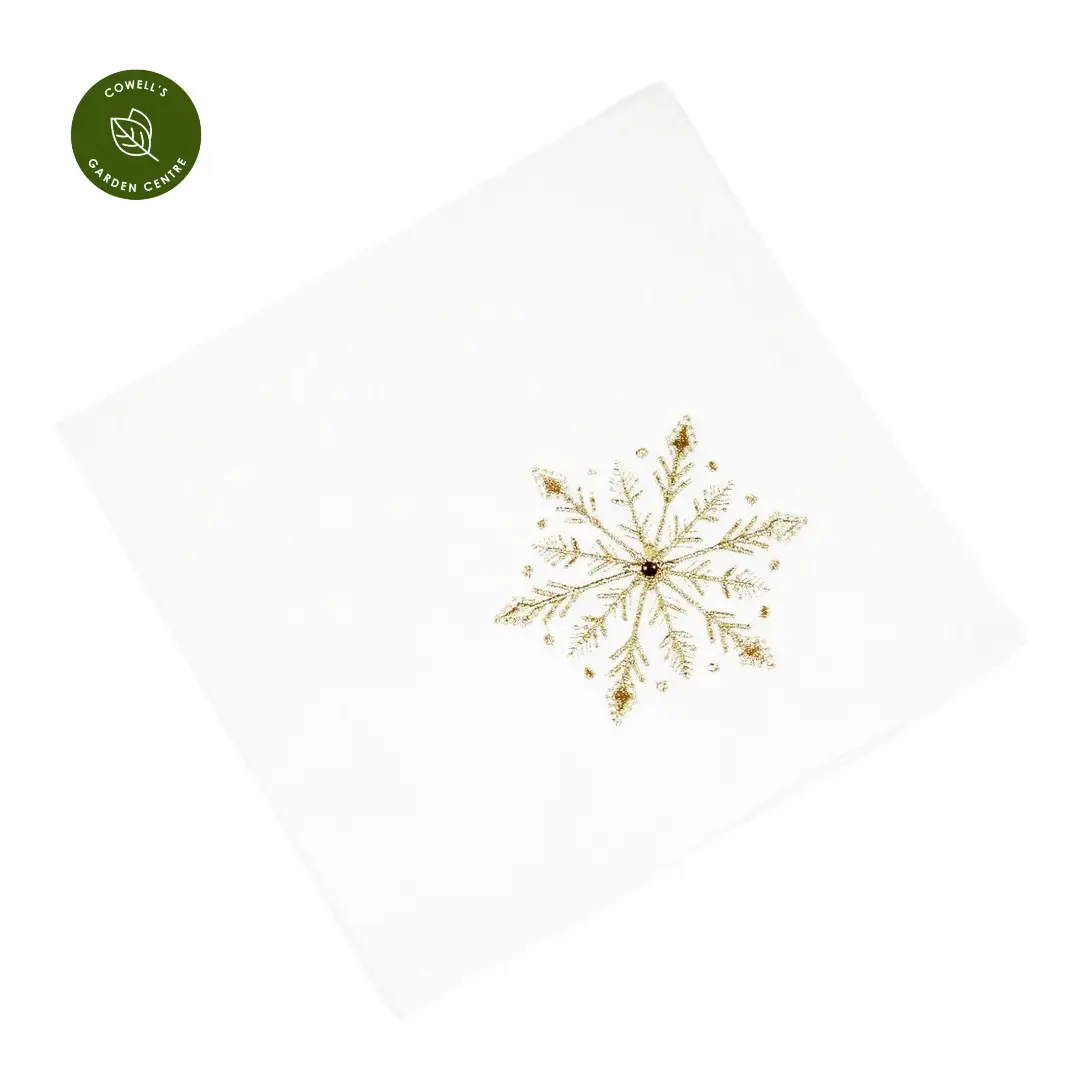 Bring some sparkle to your festive decor with the Frost Fall collection, featuring an embroidered design of golden snowflakes on a white backdrop. This set of four napkins is perfect for creating a classic seasonal atmosphere at the dining table.