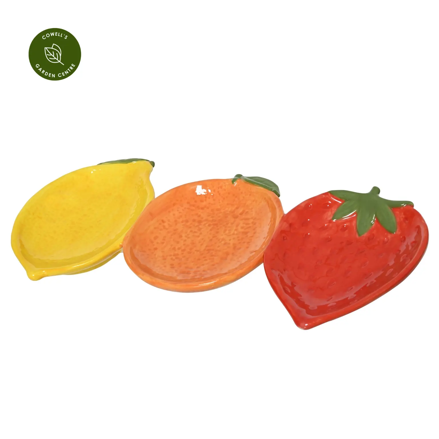 A fun and colourful glazed ceramic tapas plate featuring connected fruit-shaped sections, perfect for serving snacks, nibbles, or dips. Designed as one piece, it adds a playful touch to entertaining or casual dining.