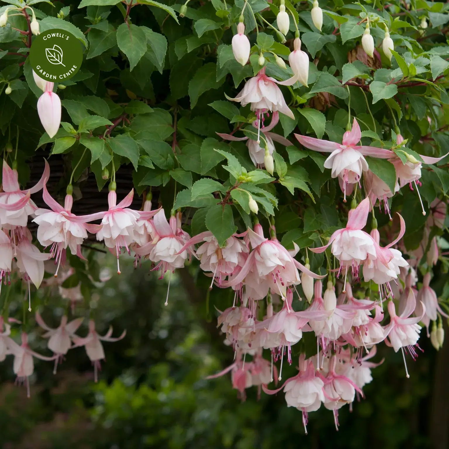 Fuchsia 'Annabelle' is a graceful, free-flowering variety producing elegant double blooms with soft white sepals and delicate pale pink centres. Its gently trailing habit makes it ideal for adding a soft, romantic feel to summer displays.