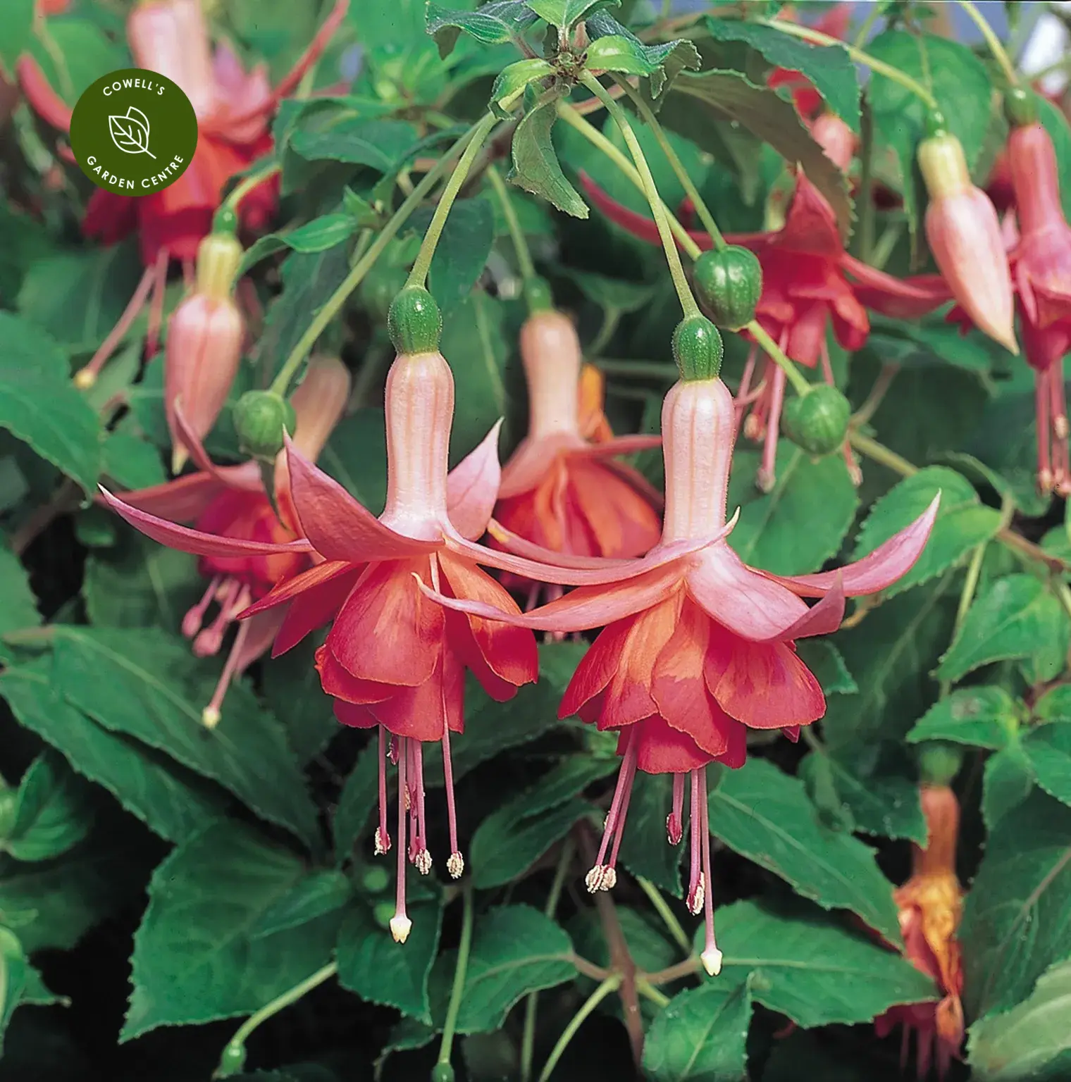 Fuchsia 'Dancing Flame' is a vibrant and eye-catching shrub, producing striking bi-coloured flowers with fiery tones that appear to glow in the garden. The elegant blooms hang delicately from arching stems, creating movement and colour throughout the summer months.