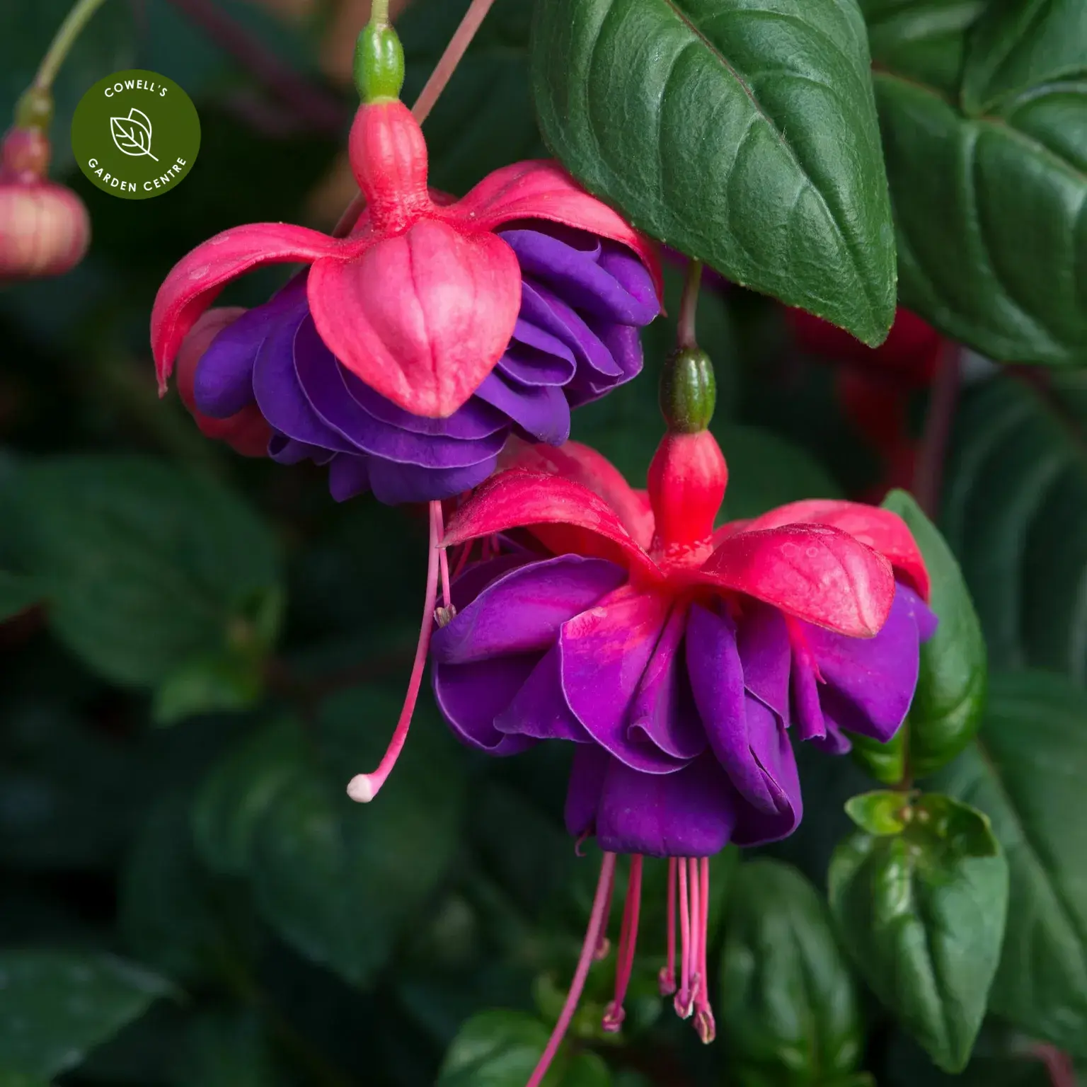 Fuchsia 'Dark Eyes' is a striking, free-flowering variety producing elegant, pendant blooms with deep crimson sepals and rich purple, almost black, inner petals. Its bold colour contrast makes it a standout choice for summer displays.