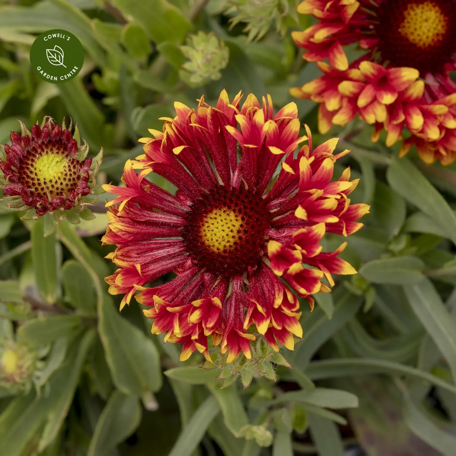 Gaillardia 'Fanfare Serenade' is a striking, long-flowering perennial producing unique pinwheel-style blooms in rich red and golden-yellow tones. Its vibrant, bi-colour flowers create a bold and cheerful display throughout the summer months.