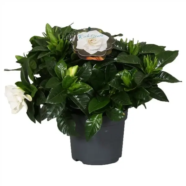 Gardenia jasminoides ‘White’ is an elegant evergreen houseplant with glossy, dark green leaves and beautifully fragrant, creamy-white blooms. The classic, rose-like flowers release a rich jasmine-like scent, bringing a touch of luxury and timeless charm to indoor spaces.