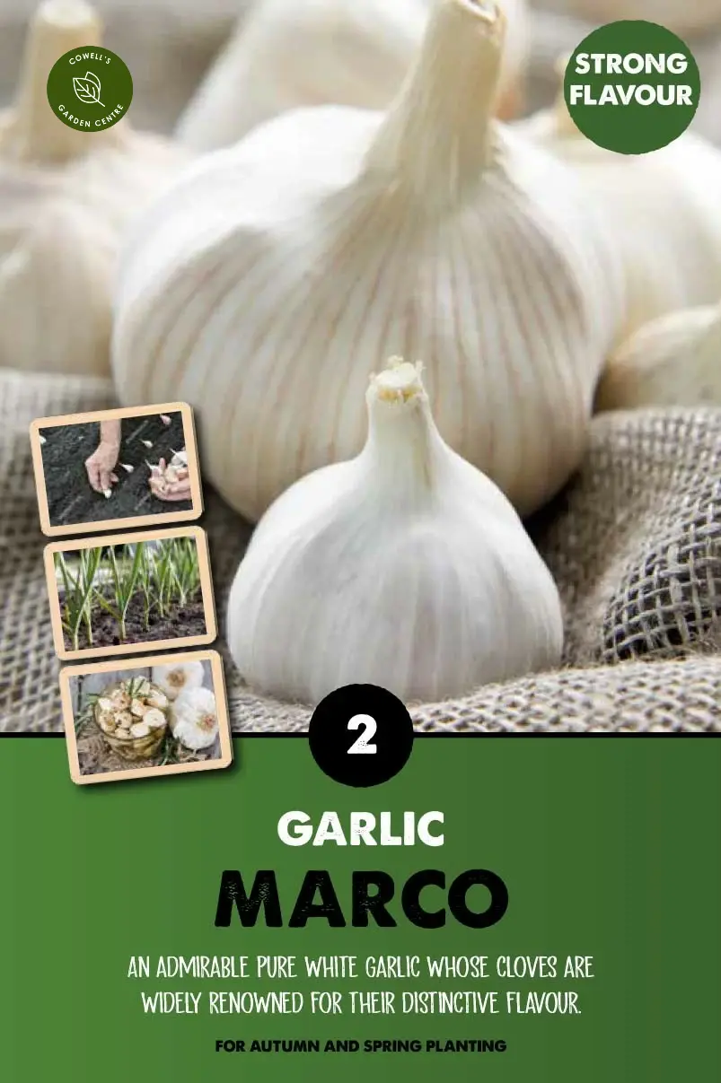 Garlic Marco is a dependable softneck garlic producing clean white bulbs with a mild, well-balanced flavour, ideal for everyday cooking and long storage.