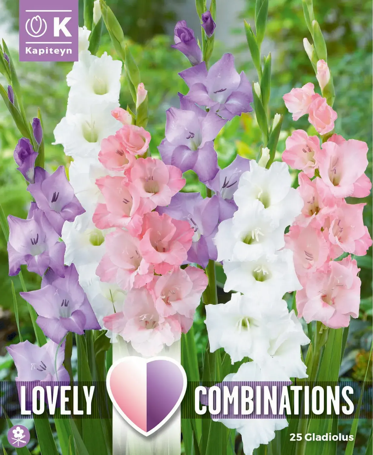 Soft combination of pastel pink, lilac and white Gladioli. These summer flowering bulbs can be planted when the last risk of frost is over.