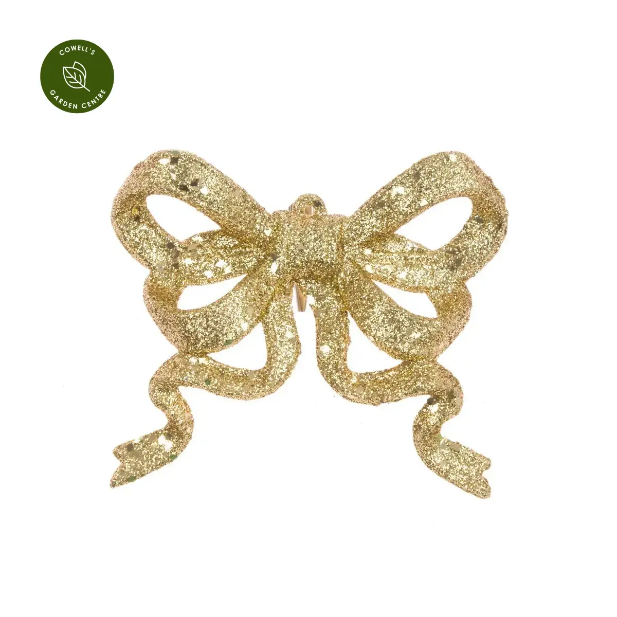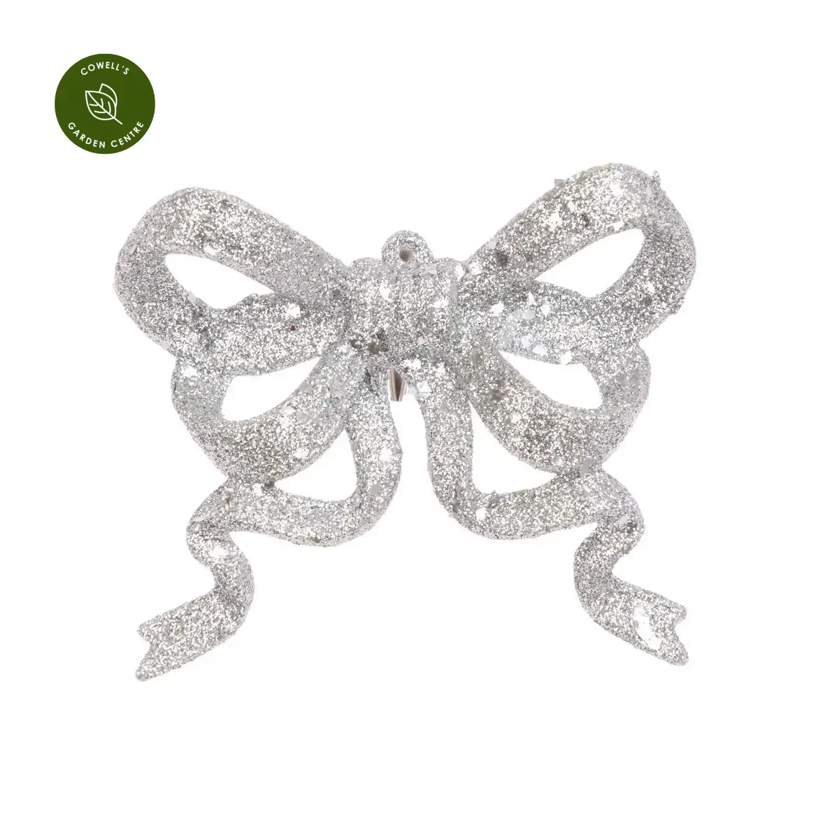 Glittering solid bow decoration with clip, ideal for enhancing a festive arrangement or adding into your Christmas tree for next level decor.