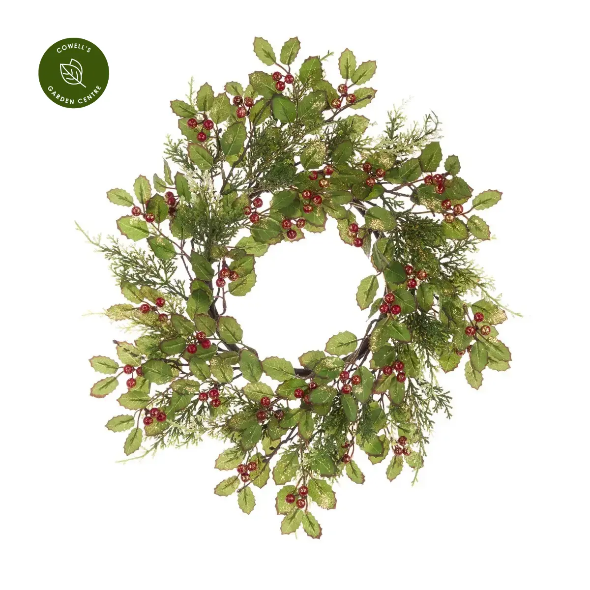 Artificial Holly foliage and berries dusted with golden glitter, shaped into a ring to enhance your candle or lighting table display.