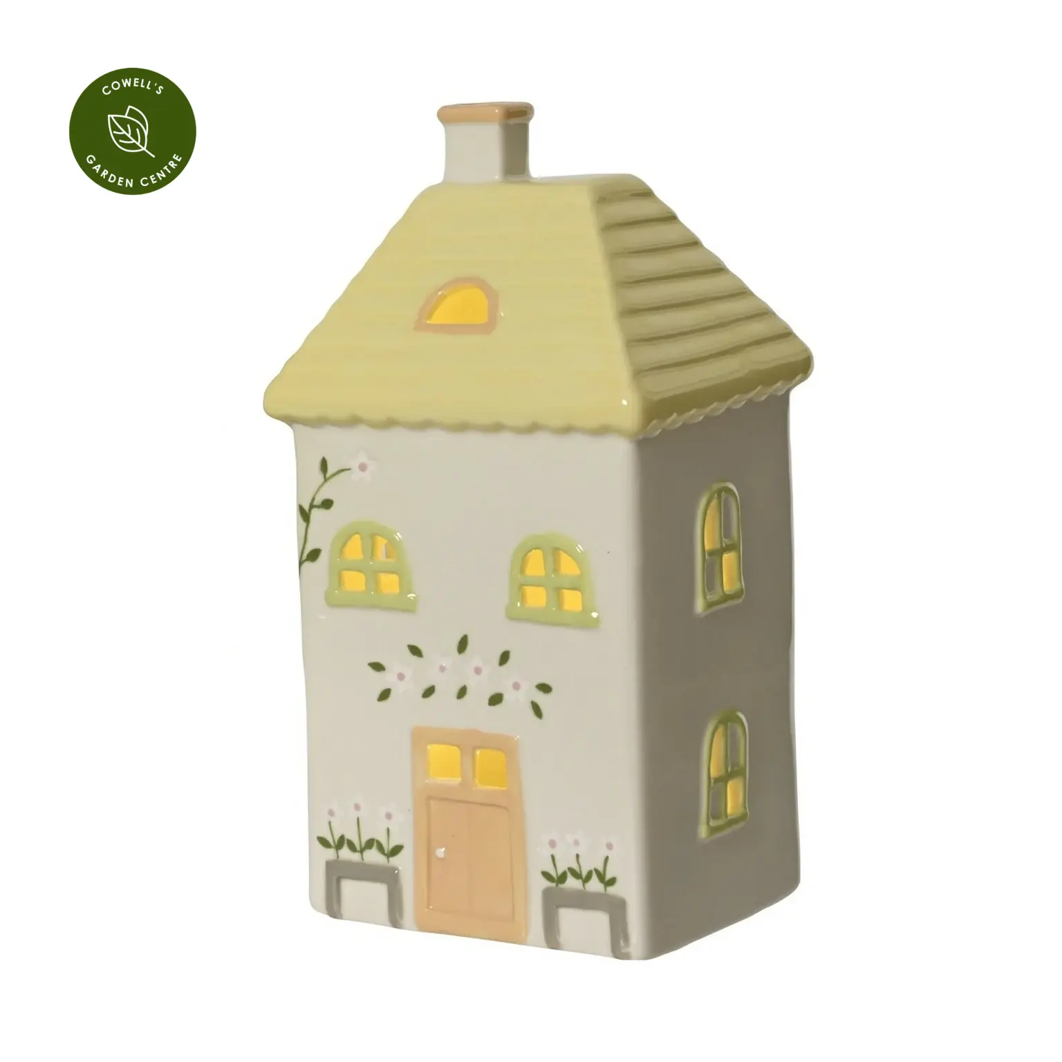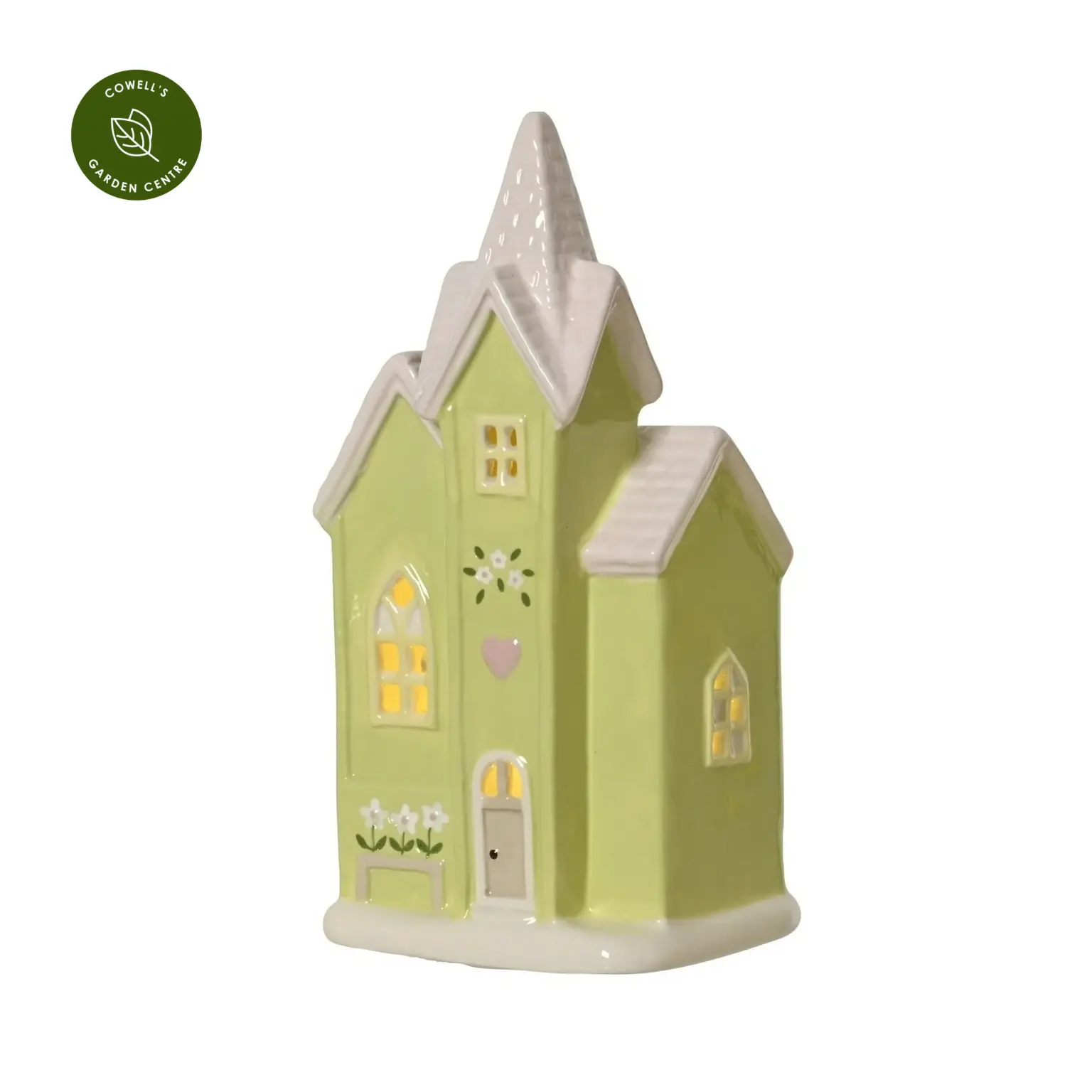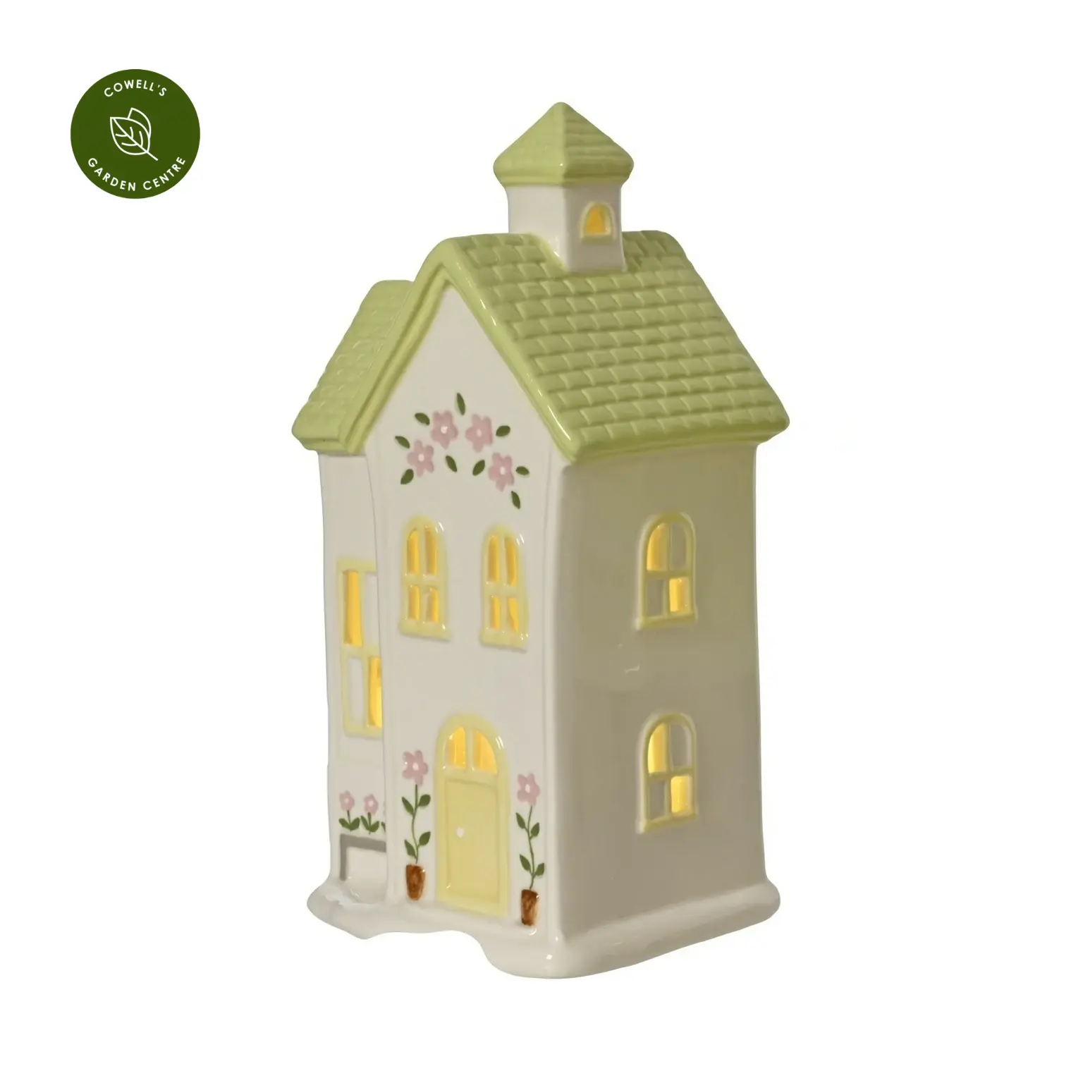 A charming handmade porcelain house with warm LED lighting, perfect for adding a cosy glow to shelves, windowsills or side tables. Available in a choice of three delicate green and yellow designs, each bringing a soft decorative touch to indoor spaces.
