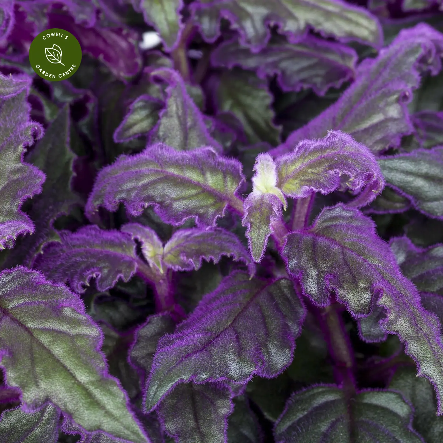 Gynura aurantiaca 'Purple Passion' is a vibrant trailing plant with soft, velvety leaves covered in striking purple hairs. Its unusual texture and bold colour give it a dramatic, almost glowing appearance, making it a standout choice for hanging baskets, shelves, or as a tabletop feature.